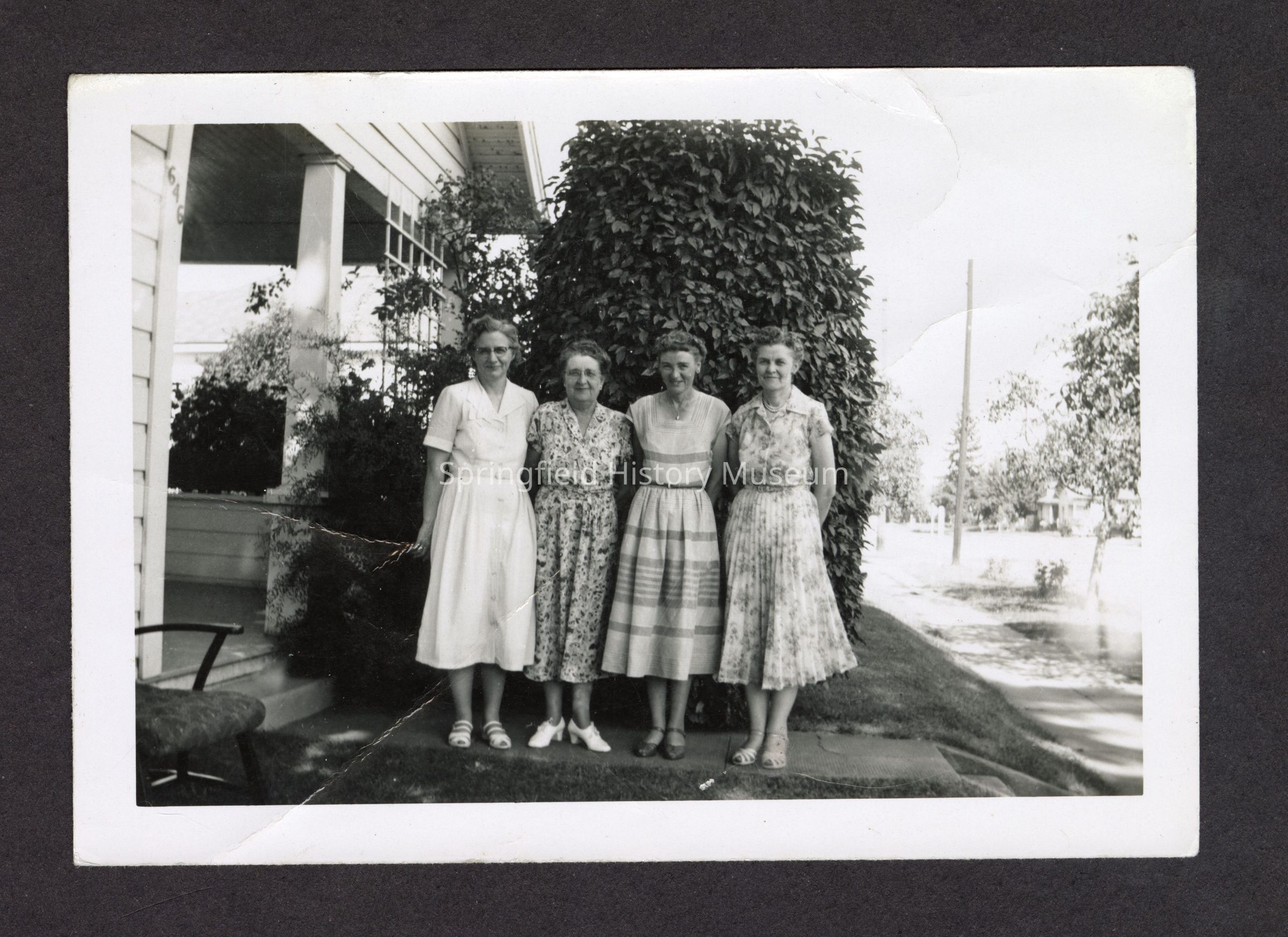 Four women on a walkway in front of a house, lady on the right might be Doris Myers. Undated, circa 1950s.Photograph Details
