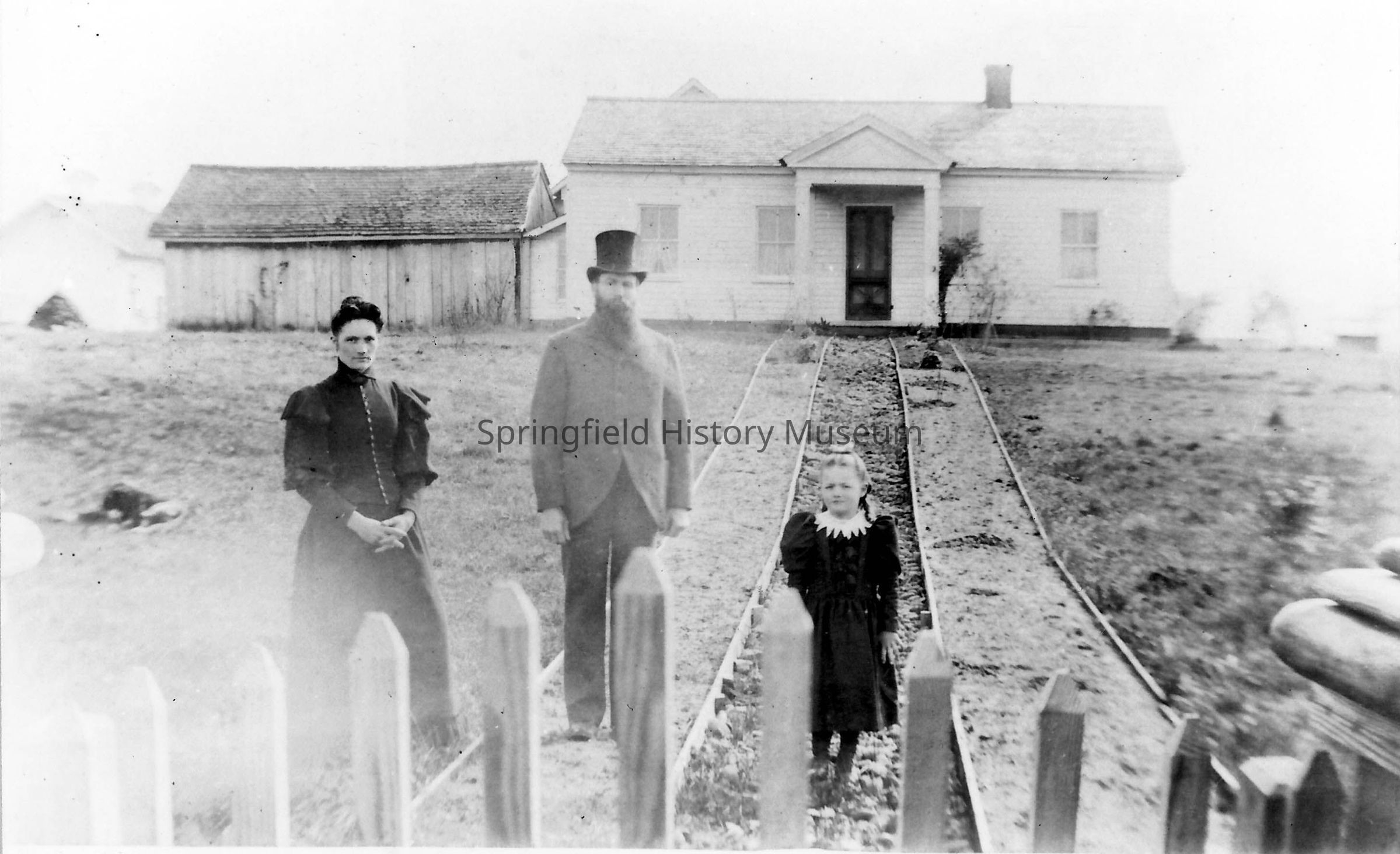 Photograph of the Douglas family in front of their first house. Florence at left, Samuel .M. and Sadie standing in front of house. House is a small one-story, symmetrical, wooden sided house with gable roof and brick chimney. It has 2 over 2 double hung windows and a pedimented porch covering protecting the front door. A number of out buildings are around the house, including an unpainted board and batten shed and another structure with two roof vents. Top of picket fence is visible in front of picture. Circa 1893Collection