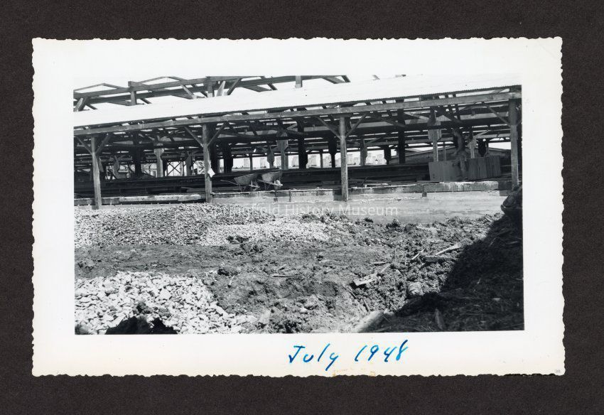 Photograph of the drainage or filling of the old log pond at Booth-Kelly Lumber Mill, at bottom in pen: "July 1948"