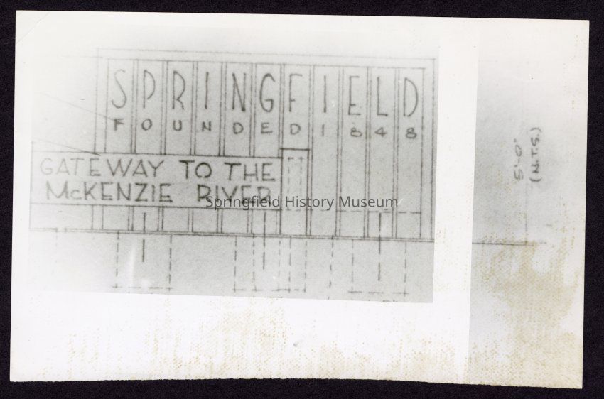 B&W Photo of a drawing of a sign "Springfield Founded 1848 Gateway to the McKenzie River".Collection