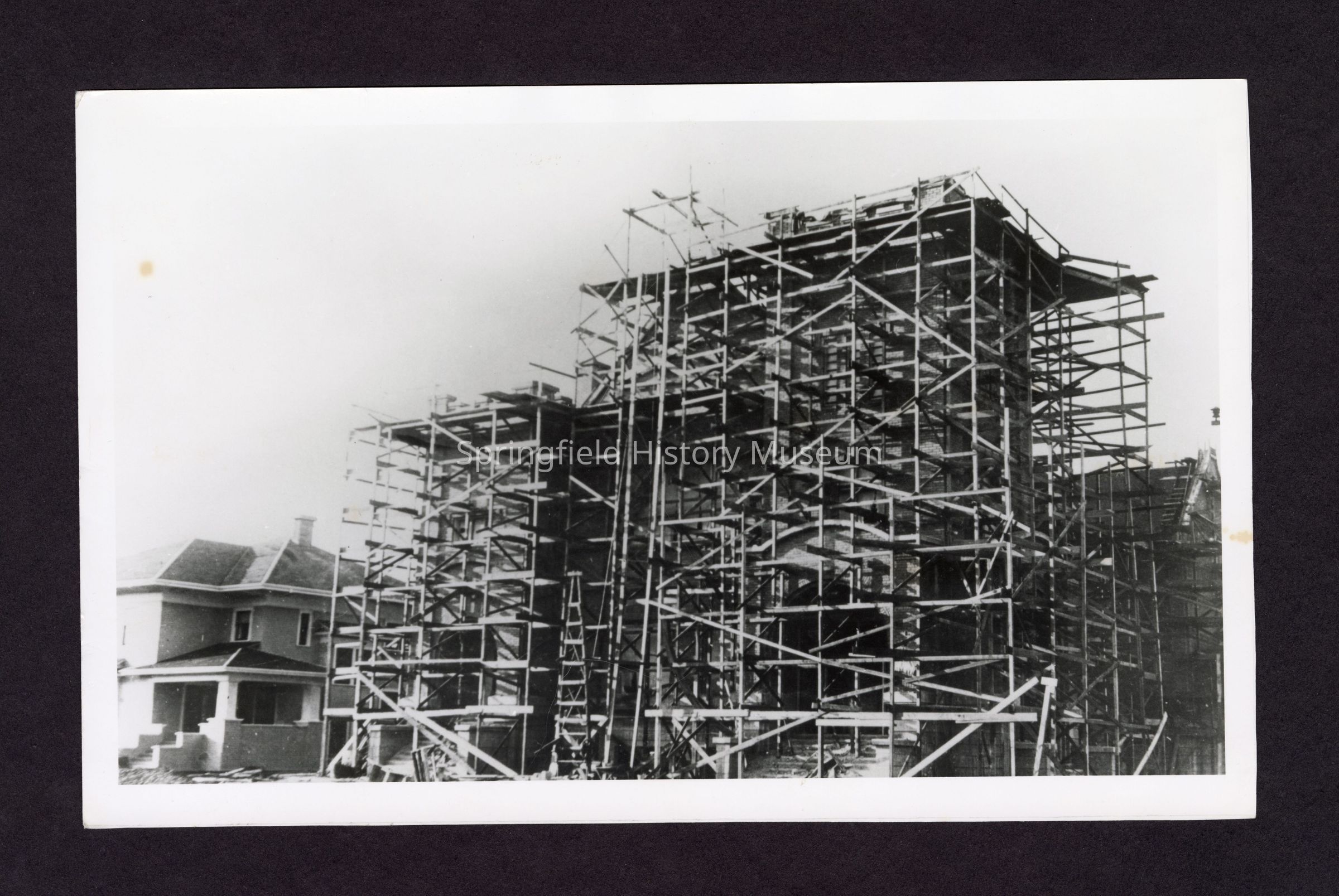 Black and white photo of the same building under constructions as in 2022.008.016. but in this photograph there is the building next to it in view as well. Donor's father Leland Davidson wrote on back; "Methodist church in Springfield. Ebbert Memorial Methodist Church"