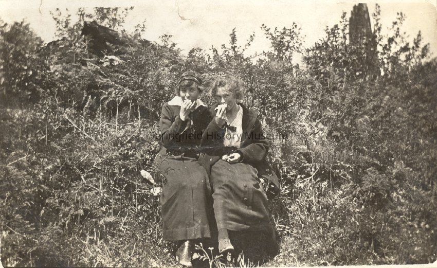 Photograph postcard of Edythe Laxton (?) and friend on a bench, undated.