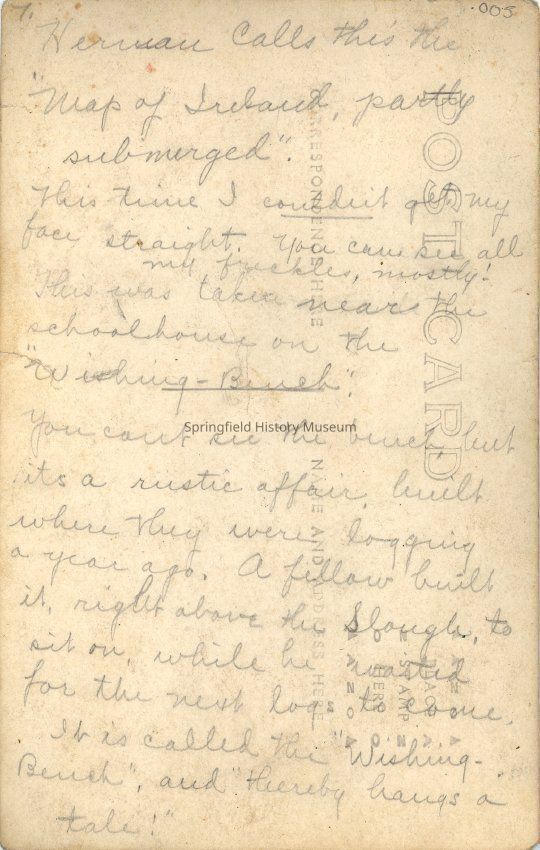 Inscription on reverse: "Herman calls this the Map of Ireland, partly submerged. This time I couldn't get my face straight. You can see all my freckles, mostly! This was taken near the schoolhouse on the Wishing-Bench. You can't see the bench, but it's a rustic affair built where they were logging a year ago. A fellow built it right above the Slough to sit on, while he waited for the next log to come. It is called the Wishing-Bench and thereby hangs a tale!"Collection