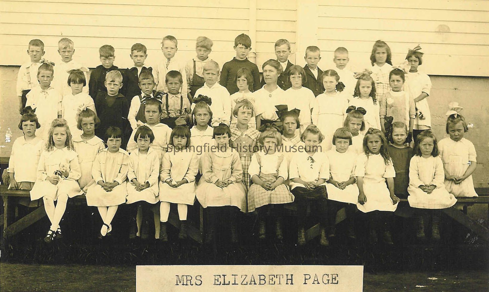Photograph of grade school students with teacher, Elizabeth Page, in center of third row. Postcard with piece of paper glued to bottom front with typed: Mrs. Elizabeth Page. Springfield, Oregon, Lincoln School, undated
