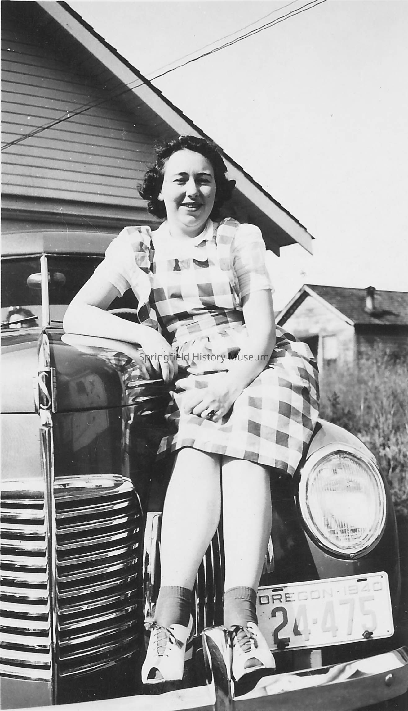 Woman, Elwina Meacham, in gingham jumper and lace-up, open-toe shoes (with socks). Sitting on Studebaker, license plate says "Oregon 1940 24-475"