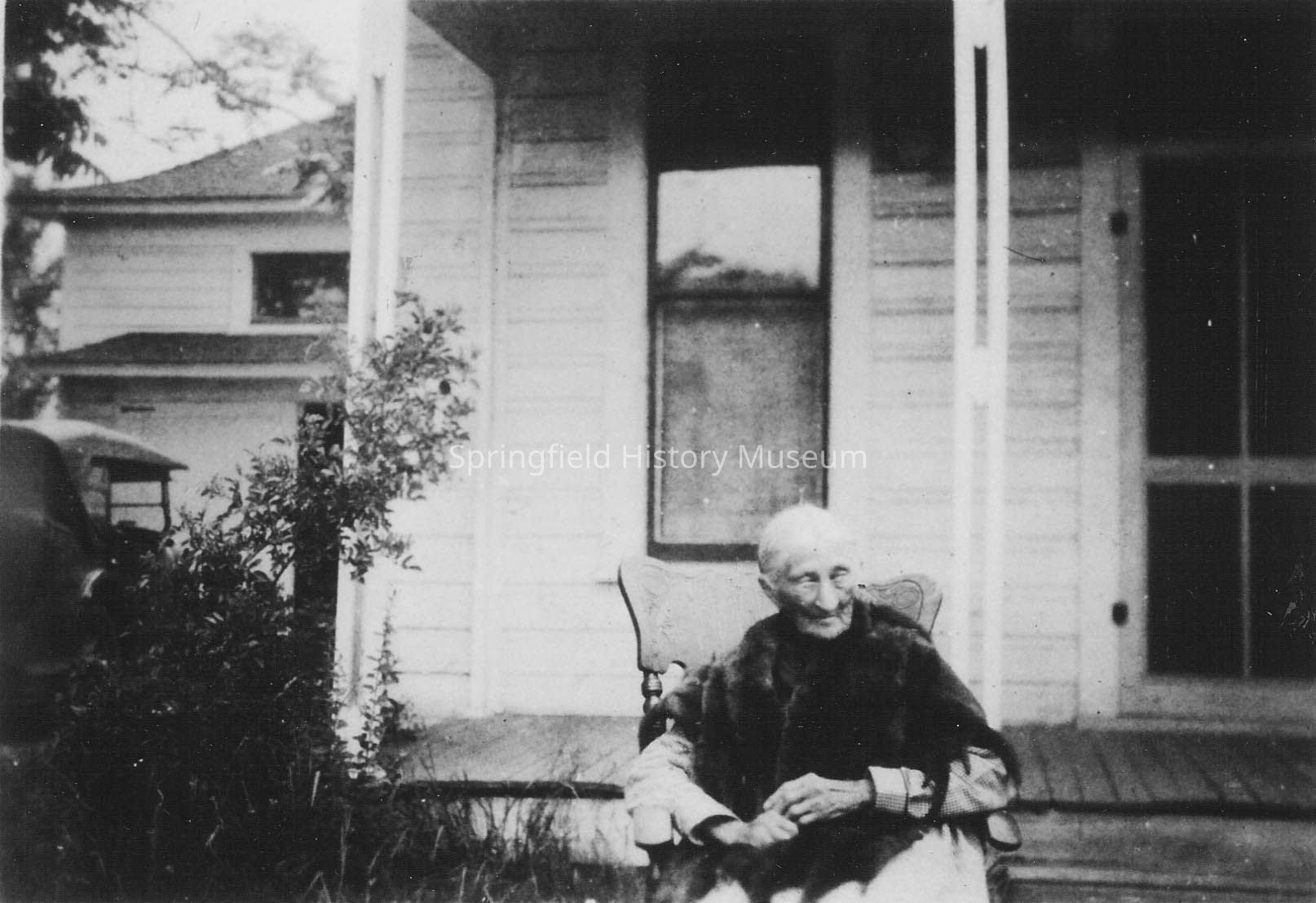 Emilia Brattain seated in a chair in front of the Brattain/Hadley House. Undated