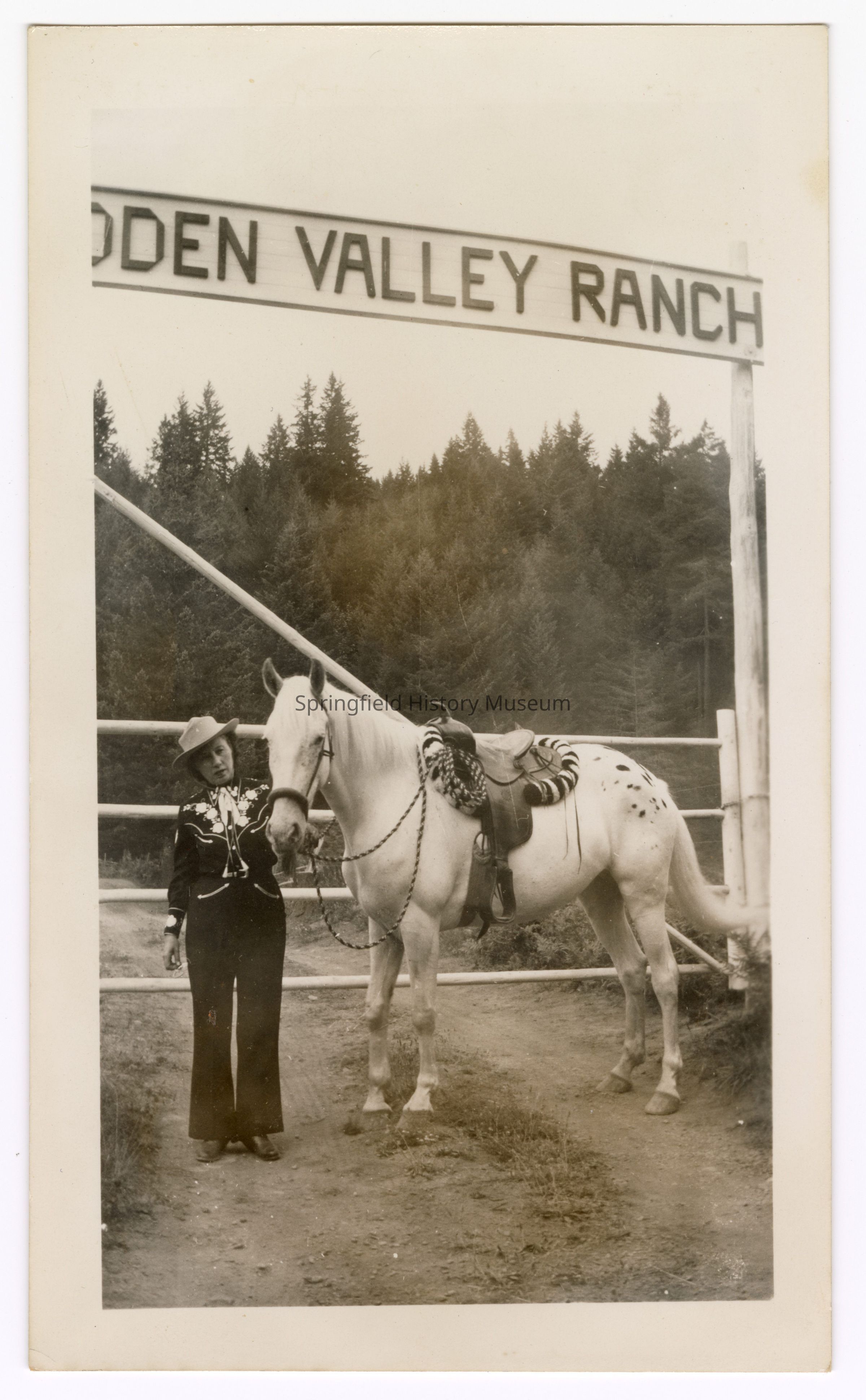 Photograph of Etta Davis with her horse under the ranch sign, Hidden Valley Ranch, Oregon, undated; Inscription back: "18"Photograph Details