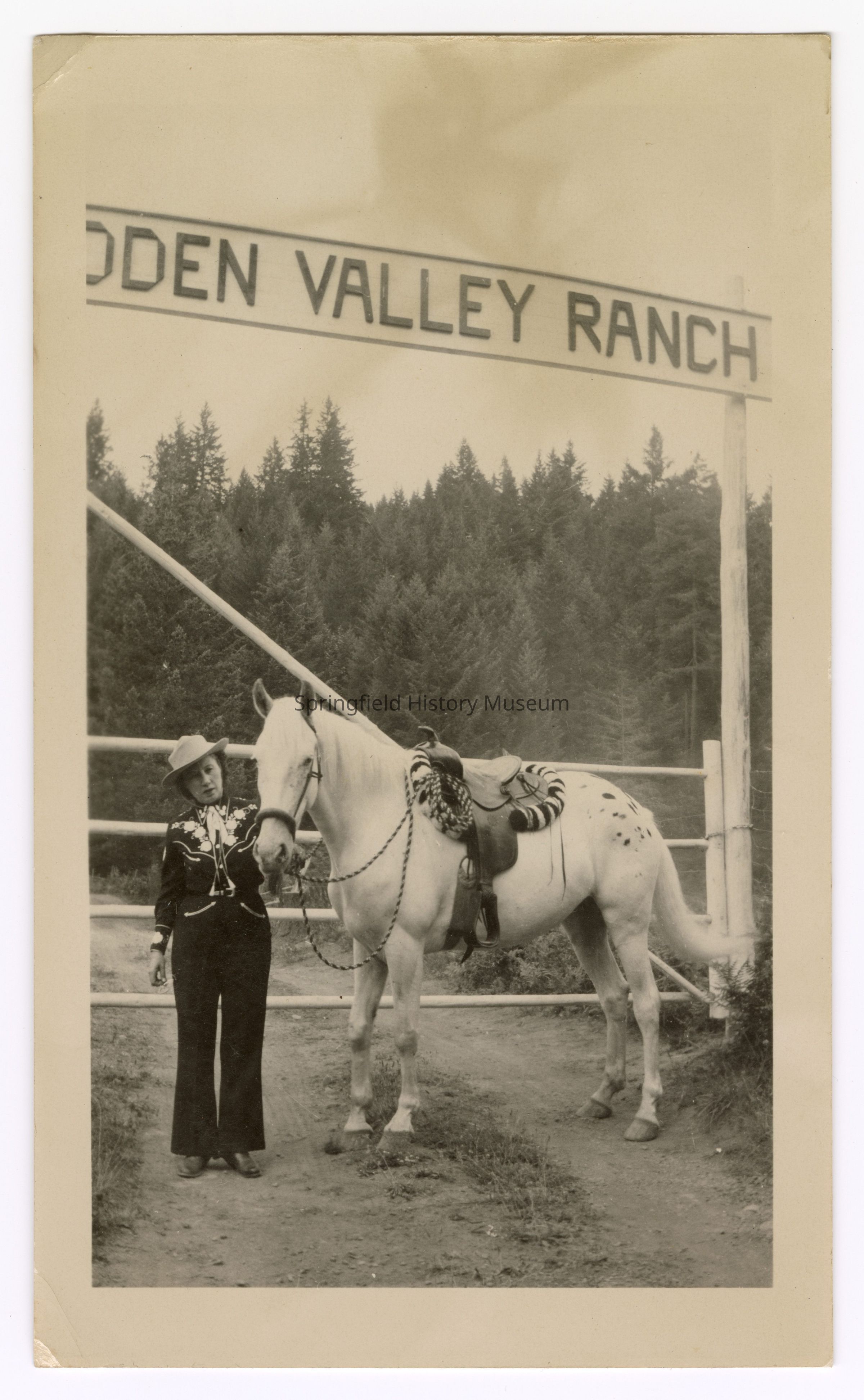 Photograph of Etta Davis with her horse under the ranch sign, Hidden Valley Ranch, Oregon, undated; Inscription back: "C64"Photograph Details