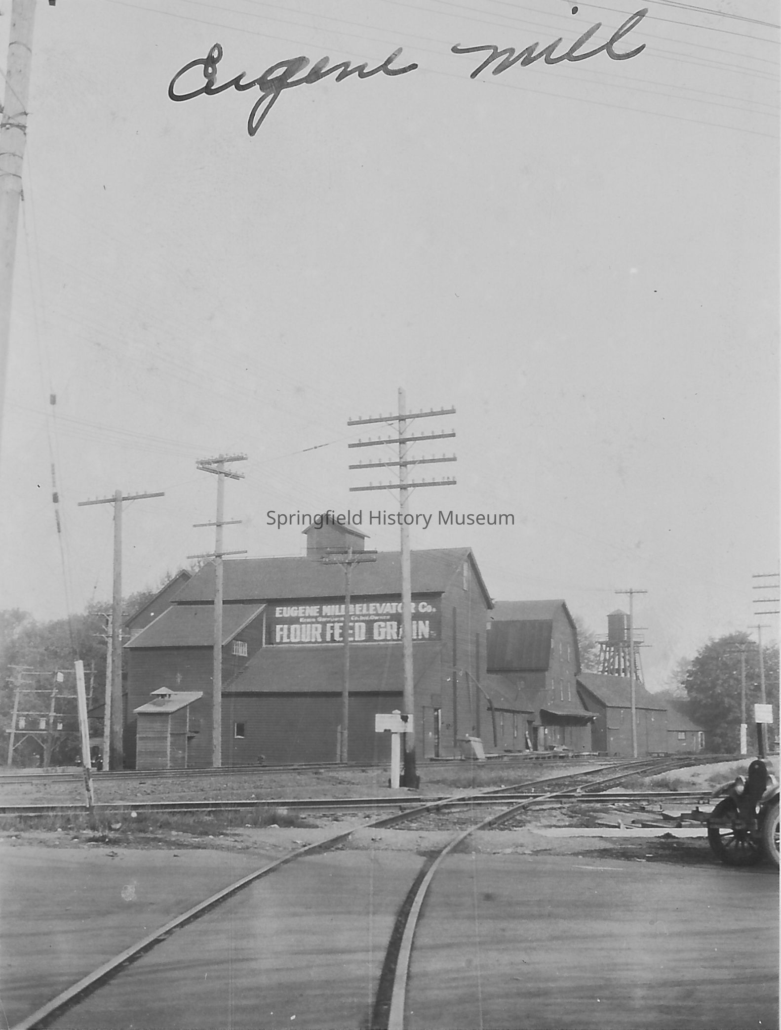 The Eugene Mill and Elevator Company building, railroad tracks running in front of the building, no date.Collection