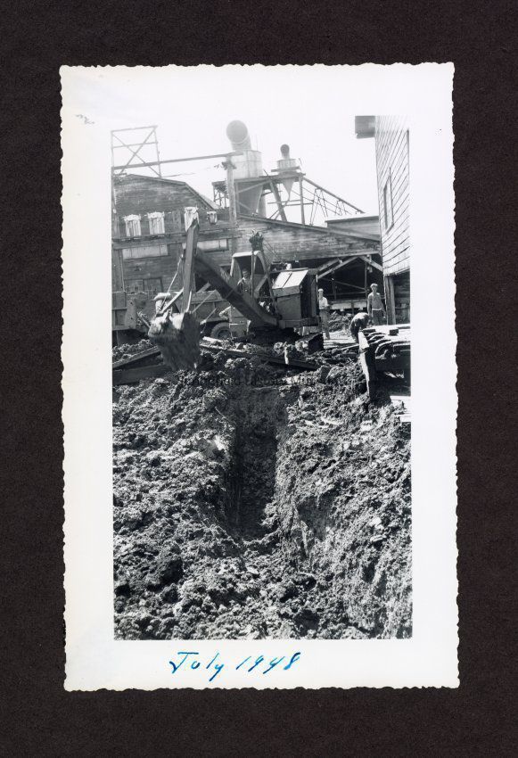 Photograph of excavator picking up dirt at Booth-Kelly Lumber mill drainage construction site, Springfield, Oregon, 1948Entry/Object ID
