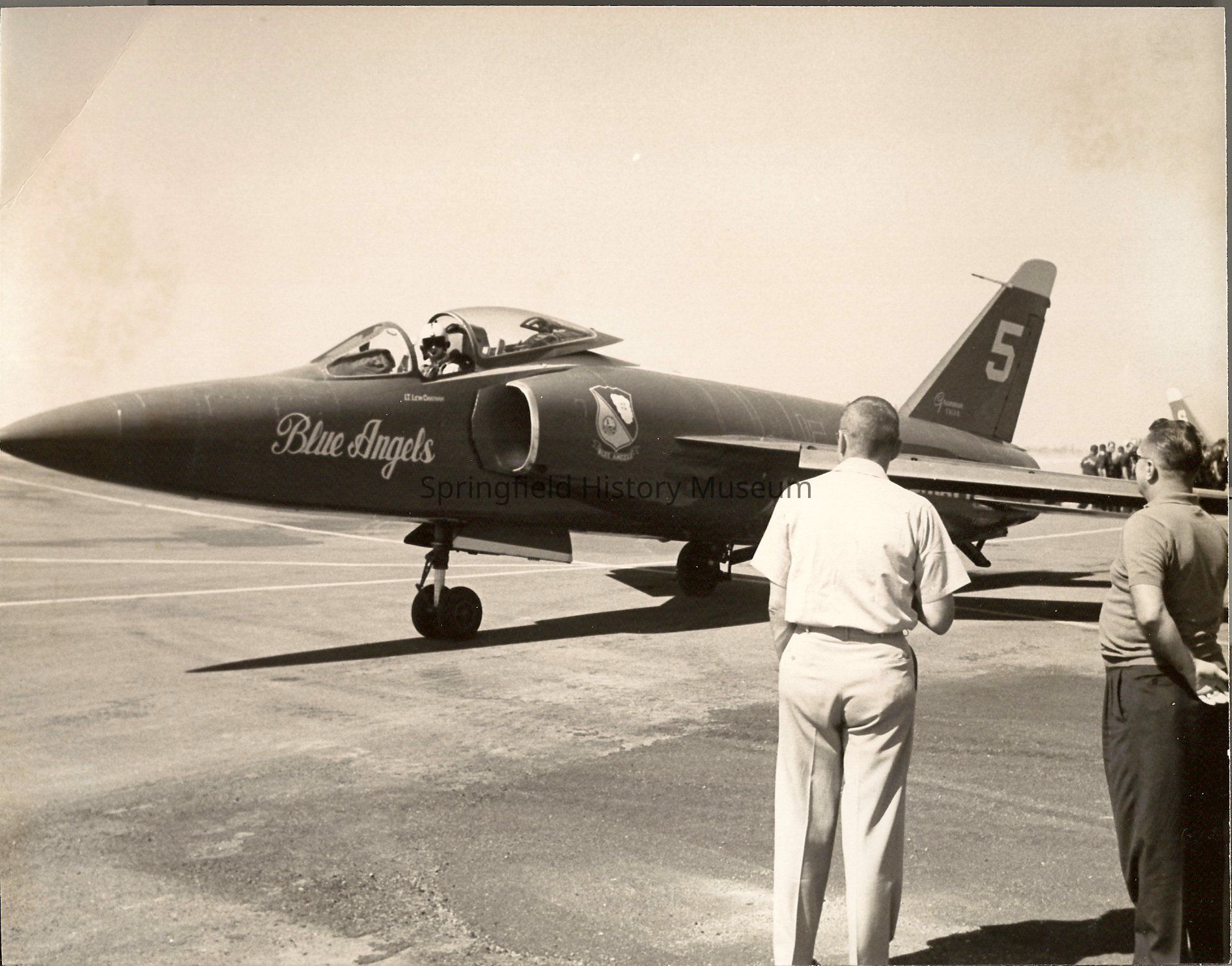 Photograph of two men looking at a F-16 Jet Blue Angels at Creswell, Oregon, Air Show, undatedPhotograph Details