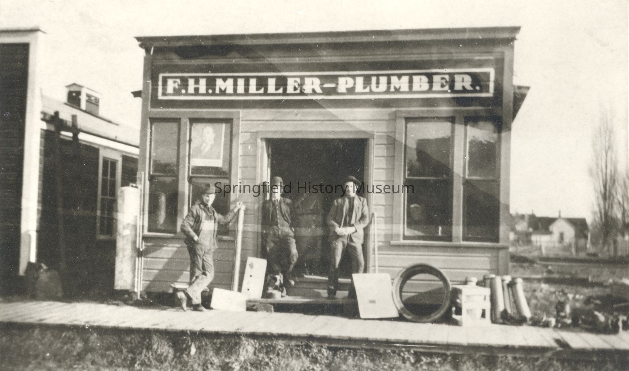 Photograph of F. H. Miller Plumber Building and three men, Springfield, Oregon, undated.