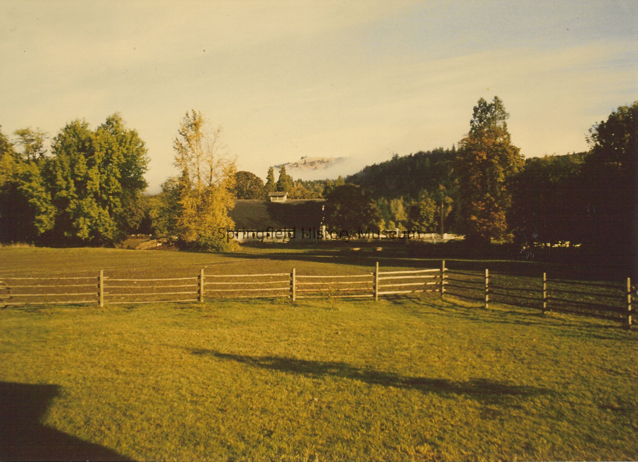 Sunny day on the farm; fence in foreground. 1996, Seavey farm