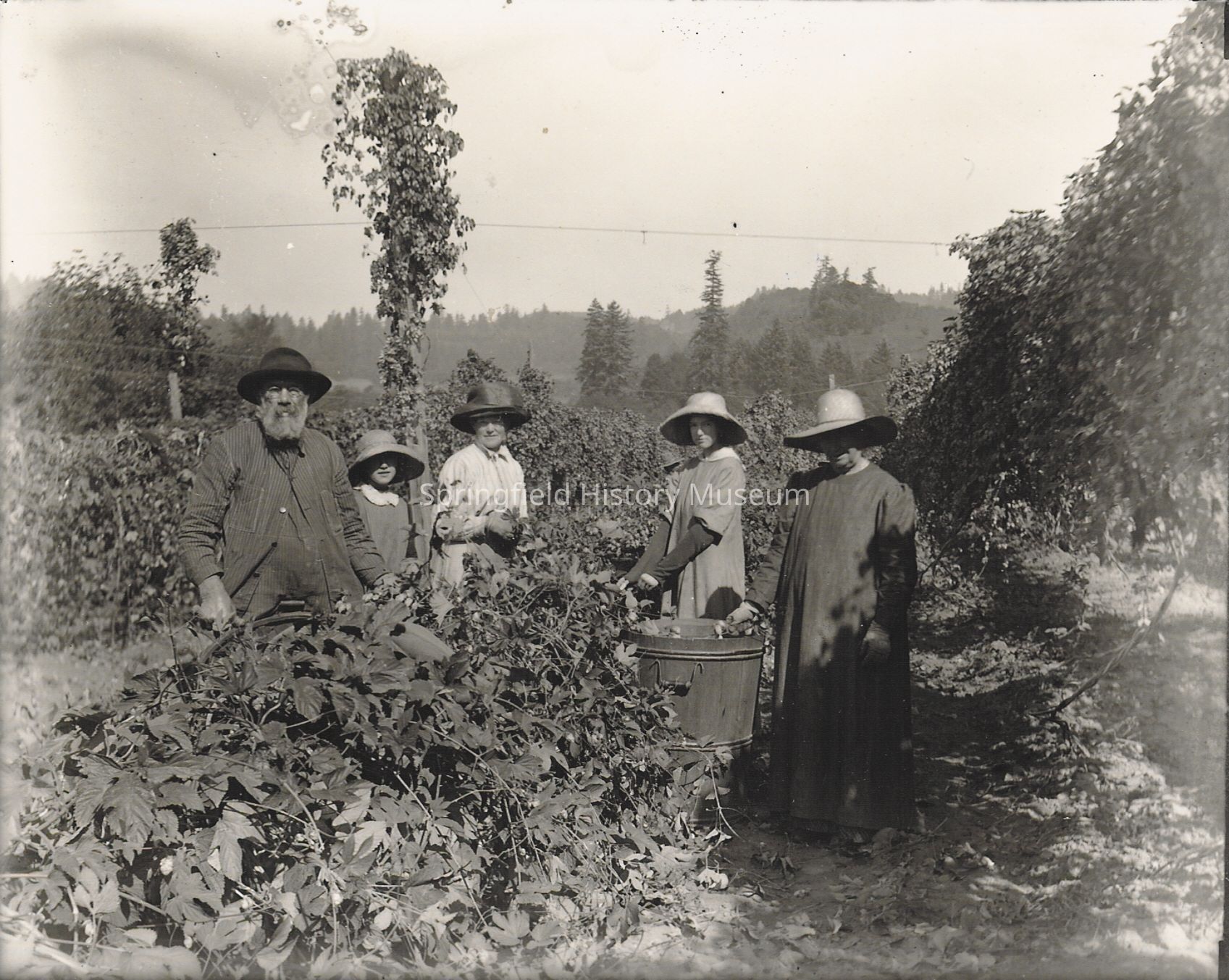 Ragsdale bunch, one man and four women all with hats picking hops at Seavey hop yard.