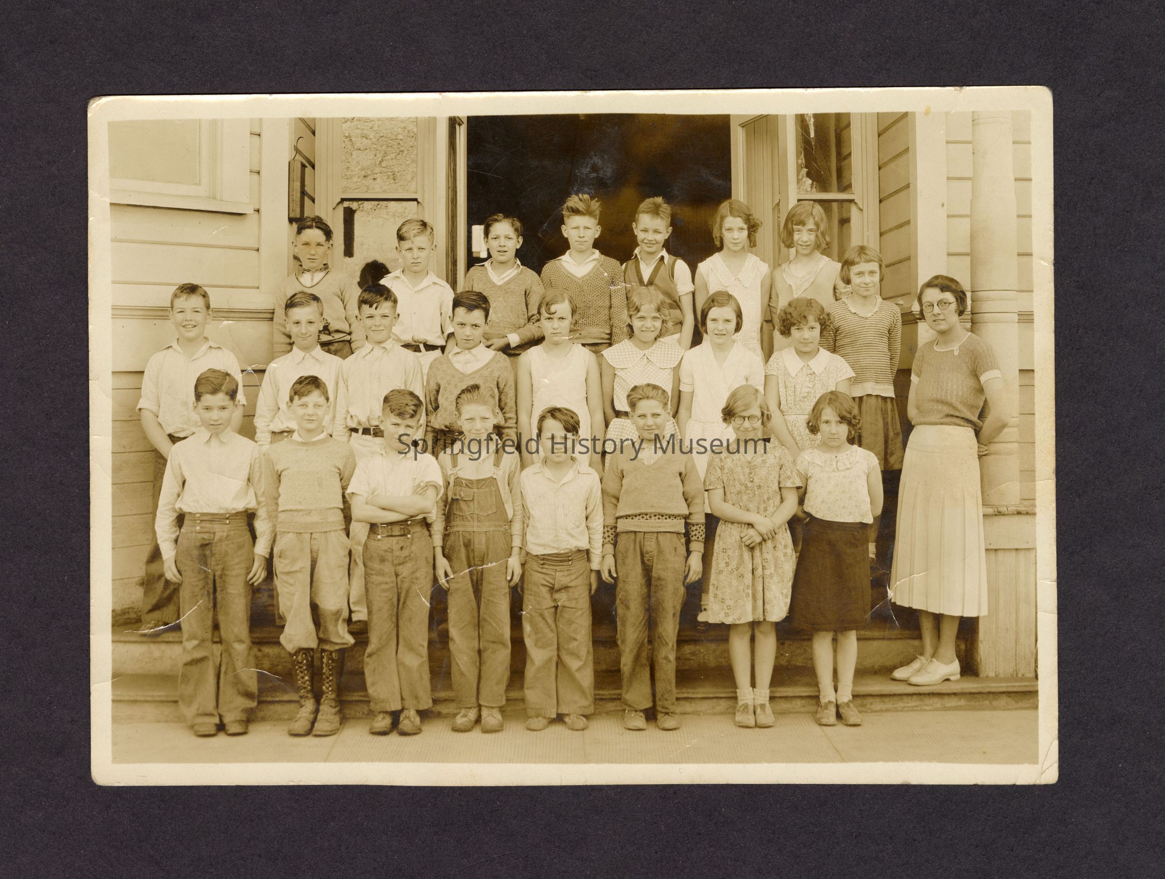 Class photograph in front of unidentified Springfield school. Teacher is at right wearing white skirt, knit shirt, and round glasses. Labeled "fifth grade" in pencil on back.Copyright