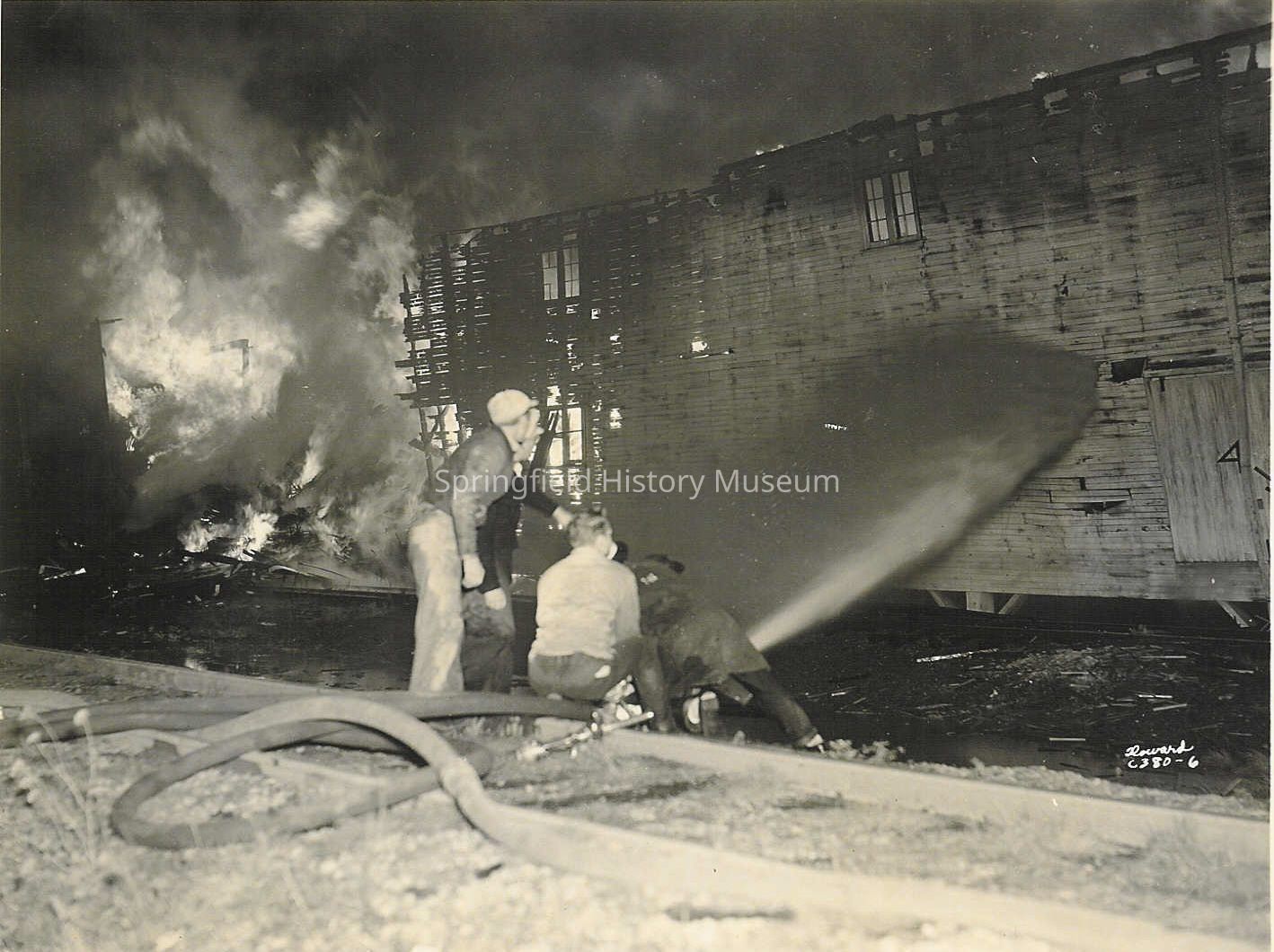 Fires, People, Winlock Handle Factory, Fire Equipment, Fire Hose, Firefighters, Railroad Tracks, Howard C380-6, Fires--Winlock Handle Factory, Fires--Fire Equipment--Fire Hose, People--Groups & IndividualsCopyright