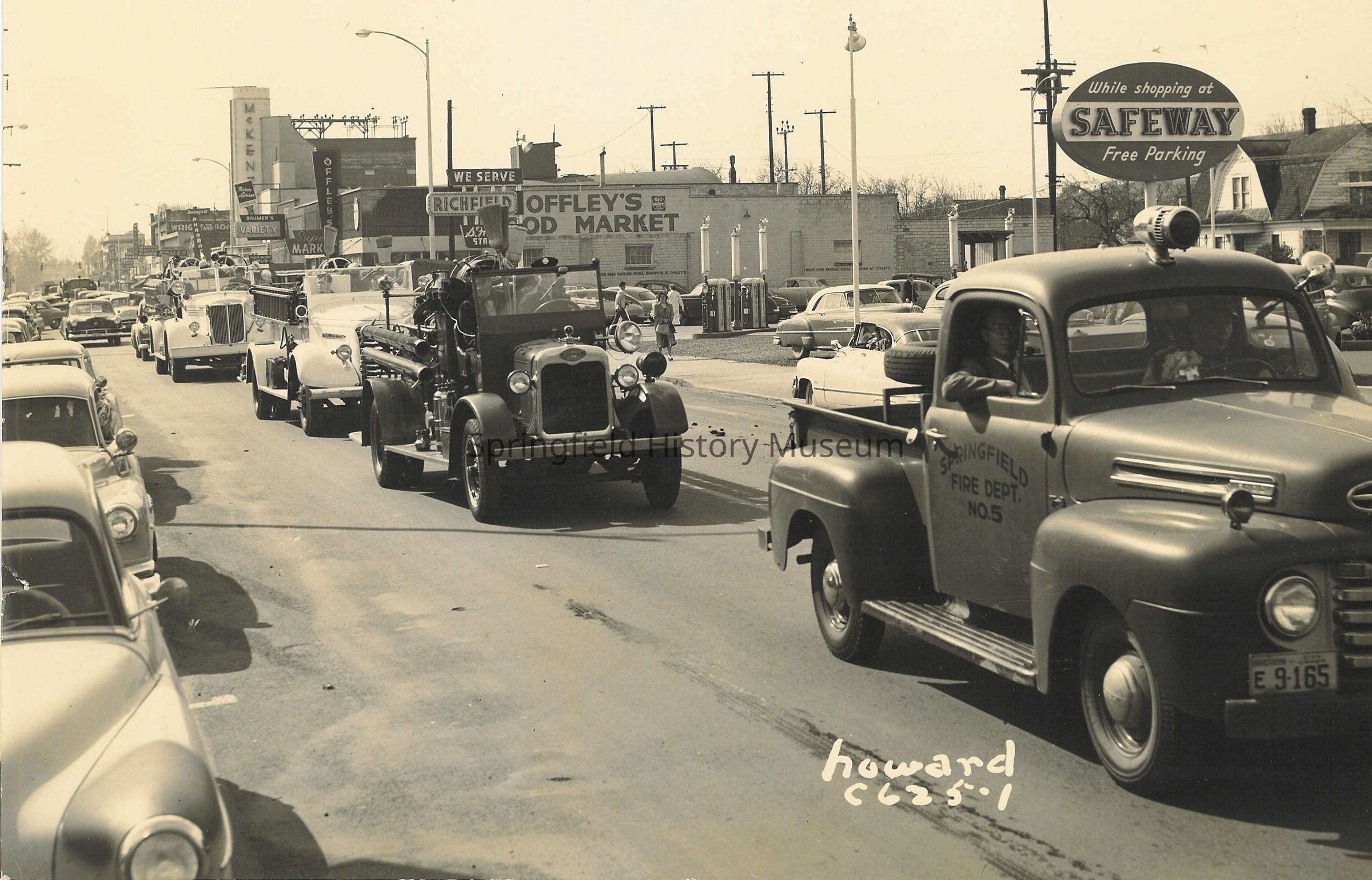 Transportation, Events & Activities, Springfield Fire Department, Fire Trucks, Parade, Main Street, Wright & Sons, Offley's Food Market, Richfield Station, Safeway, Ballmer's Variety, Howard C625-1, Fires--Springfield Fire Department, Fires--Fire Equipment--Fire Trucks, Transportation--Motor Vehicles--Trucks, Events & Activities--Parade, Springfield--Streets--Main Street, Business & Industry--Wright & Sons, Business & Industry--Offley's Food Market, Business & Industry--Richfield Station, Business & Industry--Safeway, Business & Industry--Ballmer's Variety