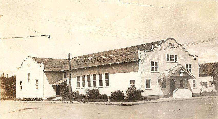 Black and white photograph of the First Christian Church of Springfield. "Springfield Church of Christ" written in pencil on the front. "First Christian Church, 4th + A, Springfield OR, 1922-45" written in ink on the back.Made/Created
