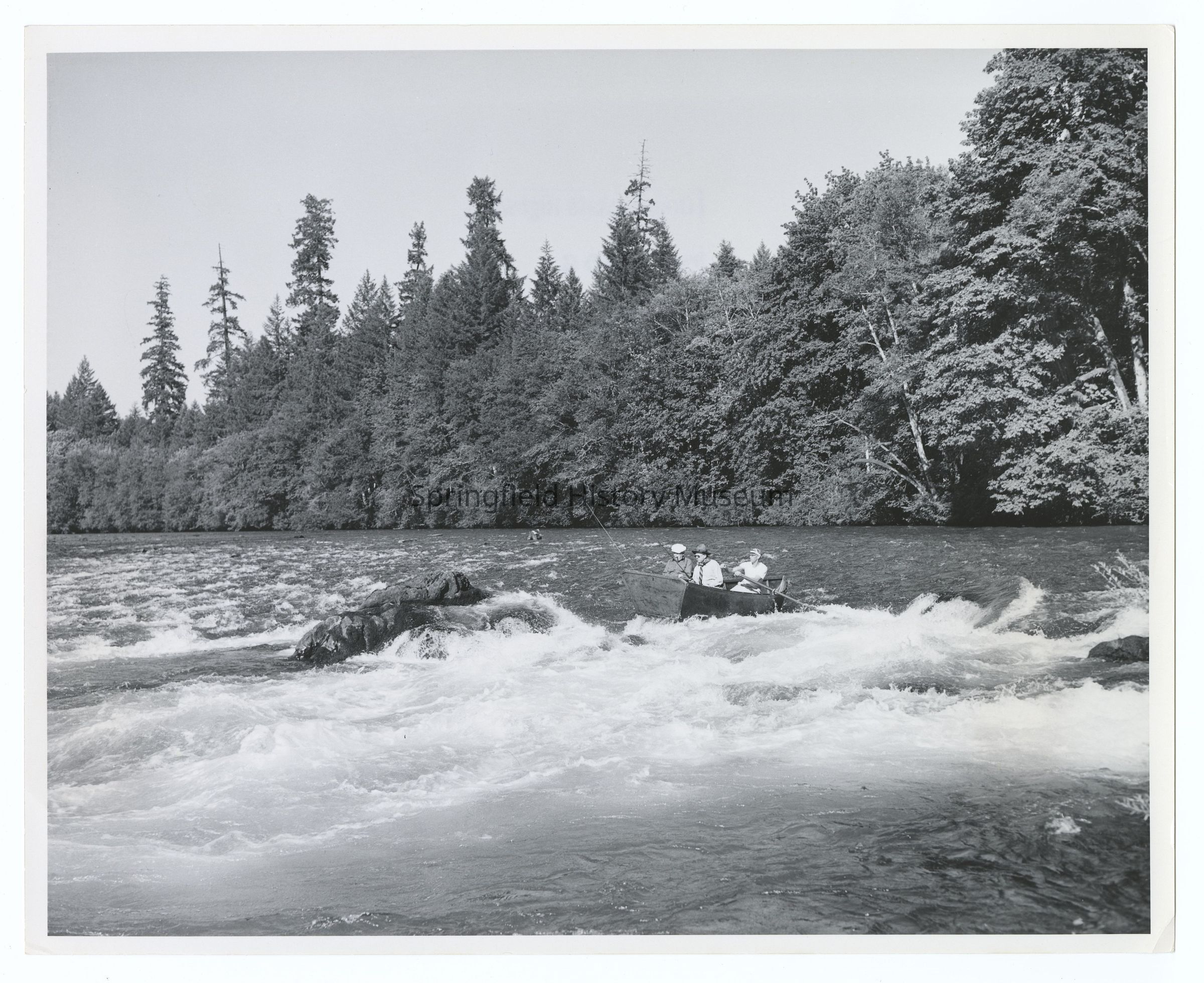 Inscription back: Three fishermen in a boat are about to ride some of the boiling rapids in the McKenzie river, well known Oregon fishing stream flowing down from the western slopes of the Cascade mountains. Oregon State Highway Commission Photo # 906