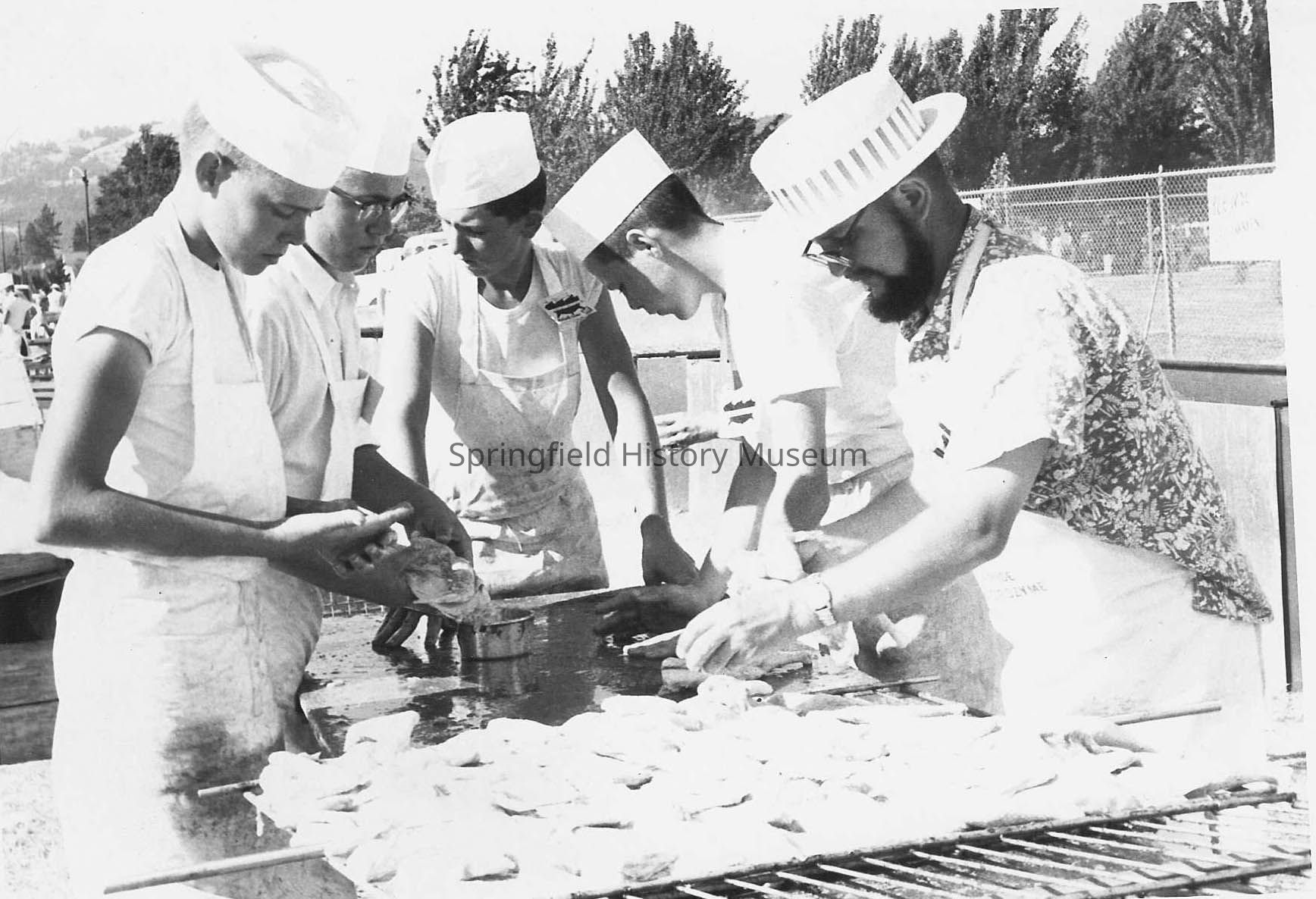 Photograph of five unknown men dressed as cooks broiling chicken. [Four are really teenage boys] Possibly Broiler Festival. Undated.