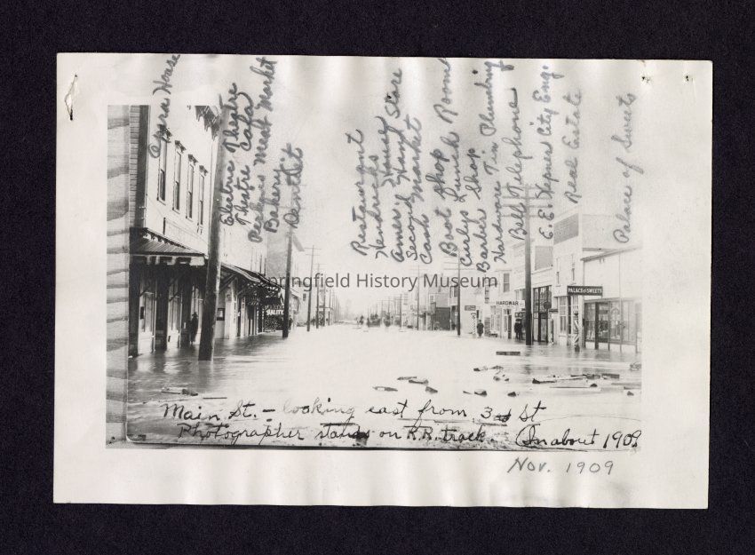 B&W Photocopy of Main St. Springfield, Oregon, Looking East from center of 3rd and Main St. at Flood Time in November 1909.The Opera House at left Foreground was the site of many of the school and social functions at this time in Springfield History. White Building next to the Opera house was my fathers "Electric Theatre".