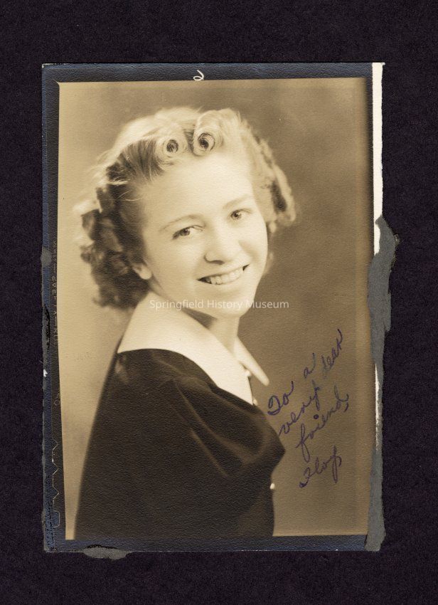 Black and white photograph of Floy Richardson. Handwritten on front is "To a very dear friend, Floy". Handwritten on back is "38 Floy Richardson". Richardson was a Senior at Springfield High School in 1938. Born Floy Collier, she married classmate Bob Richardson in September 1938.Acquisition
