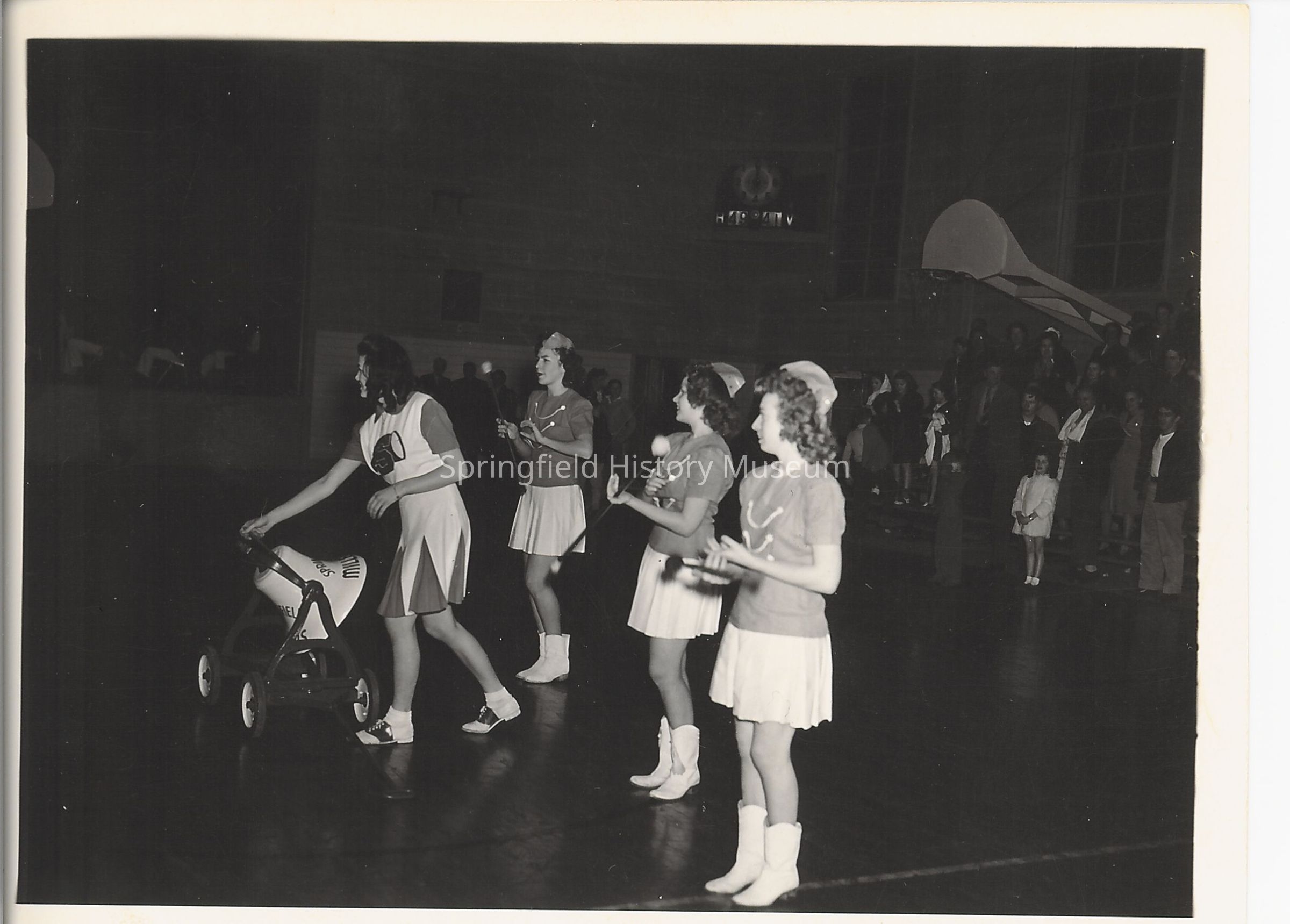 Photograph of Springfield high school cheerleaders with school victory bell. Four unknown students, with several people in background of gym. Undated.Photograph Details
