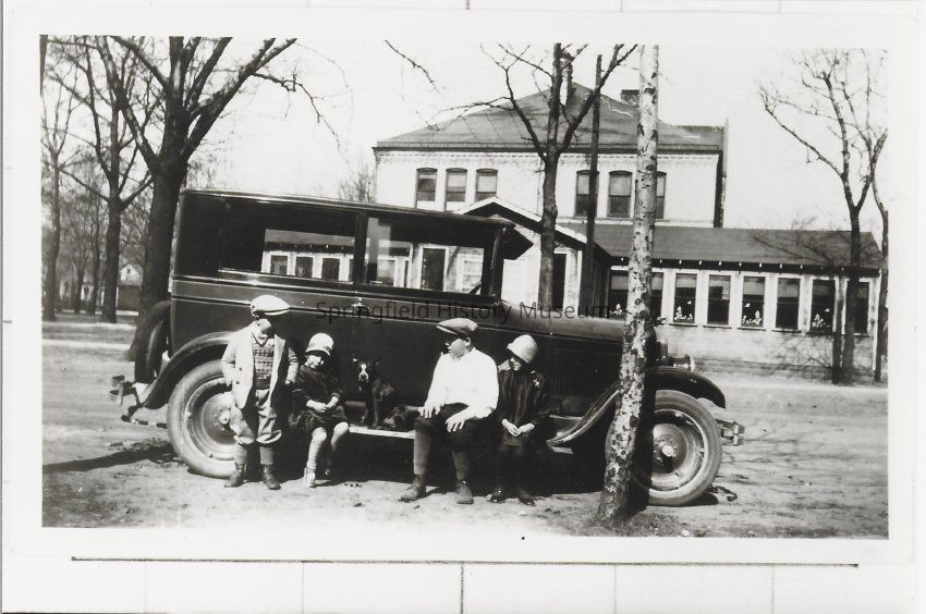 Photograph of four children and a dog sitting on the running board of an older automobile. No original photo, no date.Collection