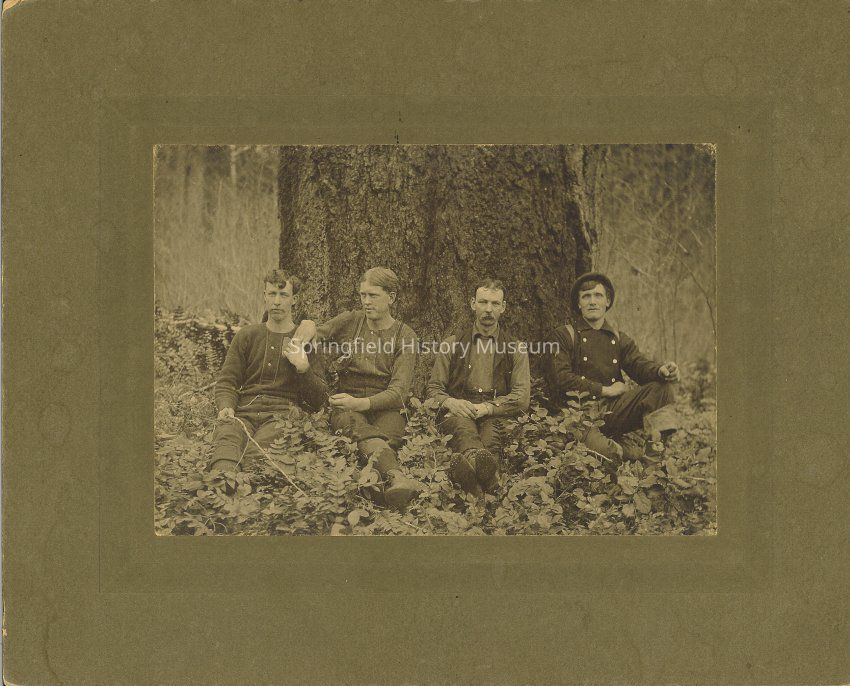 Photograph of four loggers sitting at base of tree, circa 1890-1910Entry/Object ID