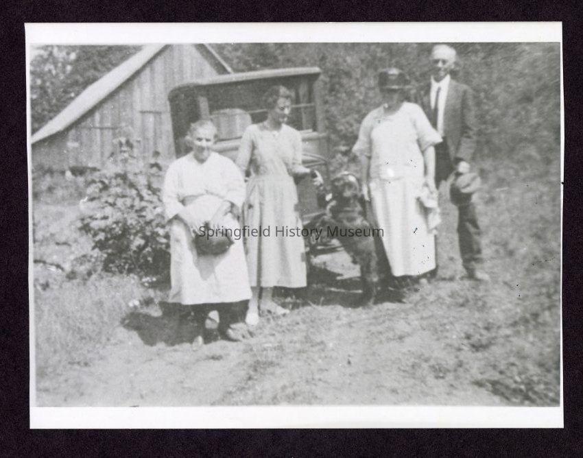 Photograph of four people with a dog in front of a car and a barn. People in photograph from left to right: Lizzie Kimmich, Edith Page, Mrs. Page and Mr. H.C. Page