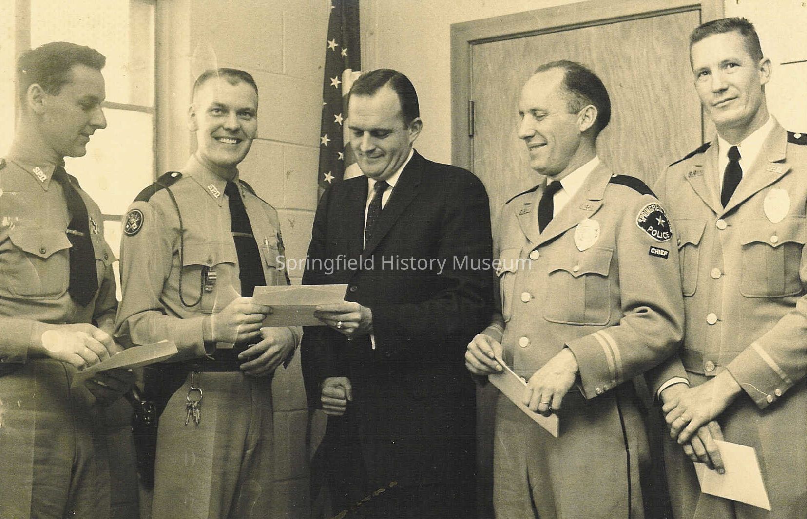 Photograph of four unknown men in police uniform; unidentified man in a suit in center. Men are holding envelopes. Man second from right has "Chief" on shoulder. Undated.Collection