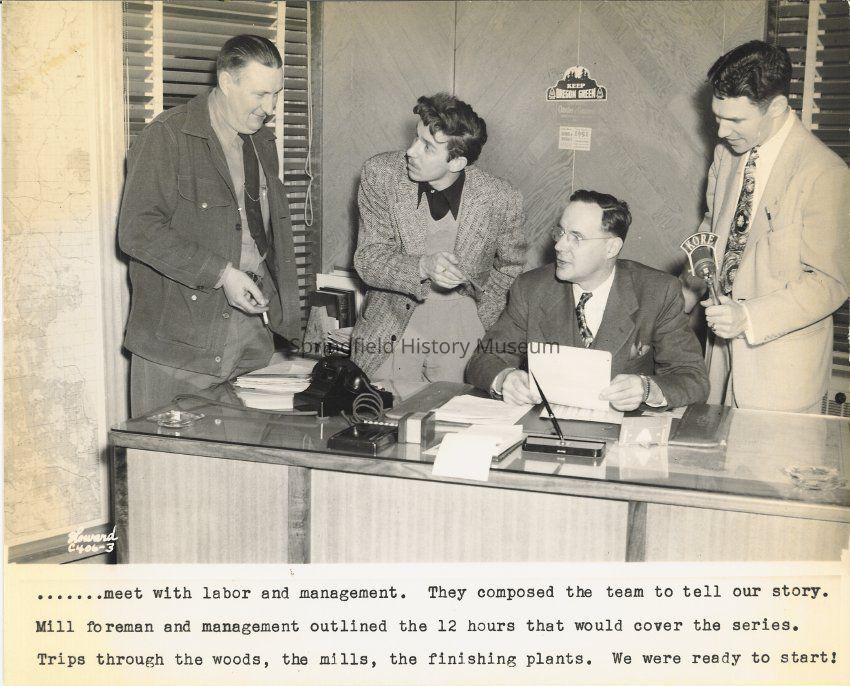 Transcribed inscription on front: ".....meet with labor and management. They composed the team to tell our story. Mill foreman and management outlined the 12 hours that would cover the series. Trips through the woods, the mills, the finishing plants. We were ready to start!"Photograph Details