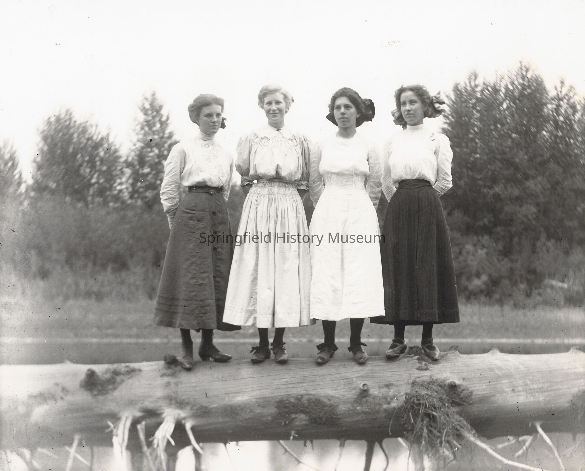 Women standing on a log over the river. Kate, Grace, Stella and Erma. September 11, 1910Collection