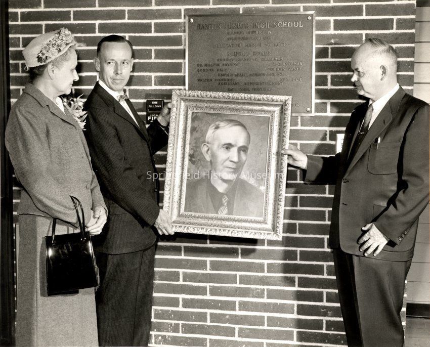 Photograph of Frank Hamlin memorial picture presentation at Hamlin Junior High, Springfield, Oregon, March 1958.Entry/Object ID