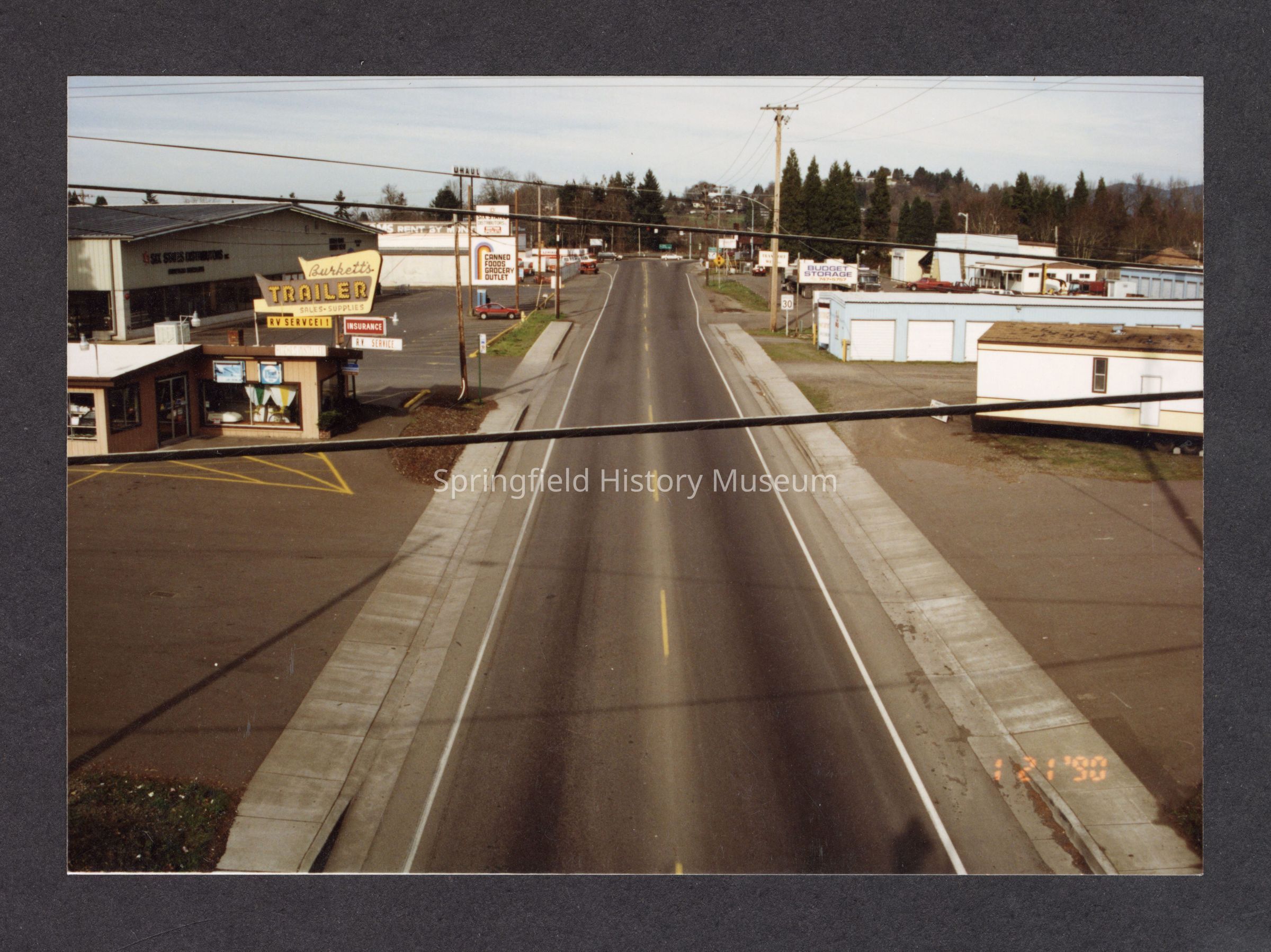 Color aerial photograph taken from railroad trestle looking north toward Franklin Blvd where a roundabout is today. Kelly Butte in background. Visible businesses include: Burkett's Trailer Sales, Six States Distributors, Canned Goods Grocery Outlet, U-Haul, Budget Storage. January 21, 1990.Collection