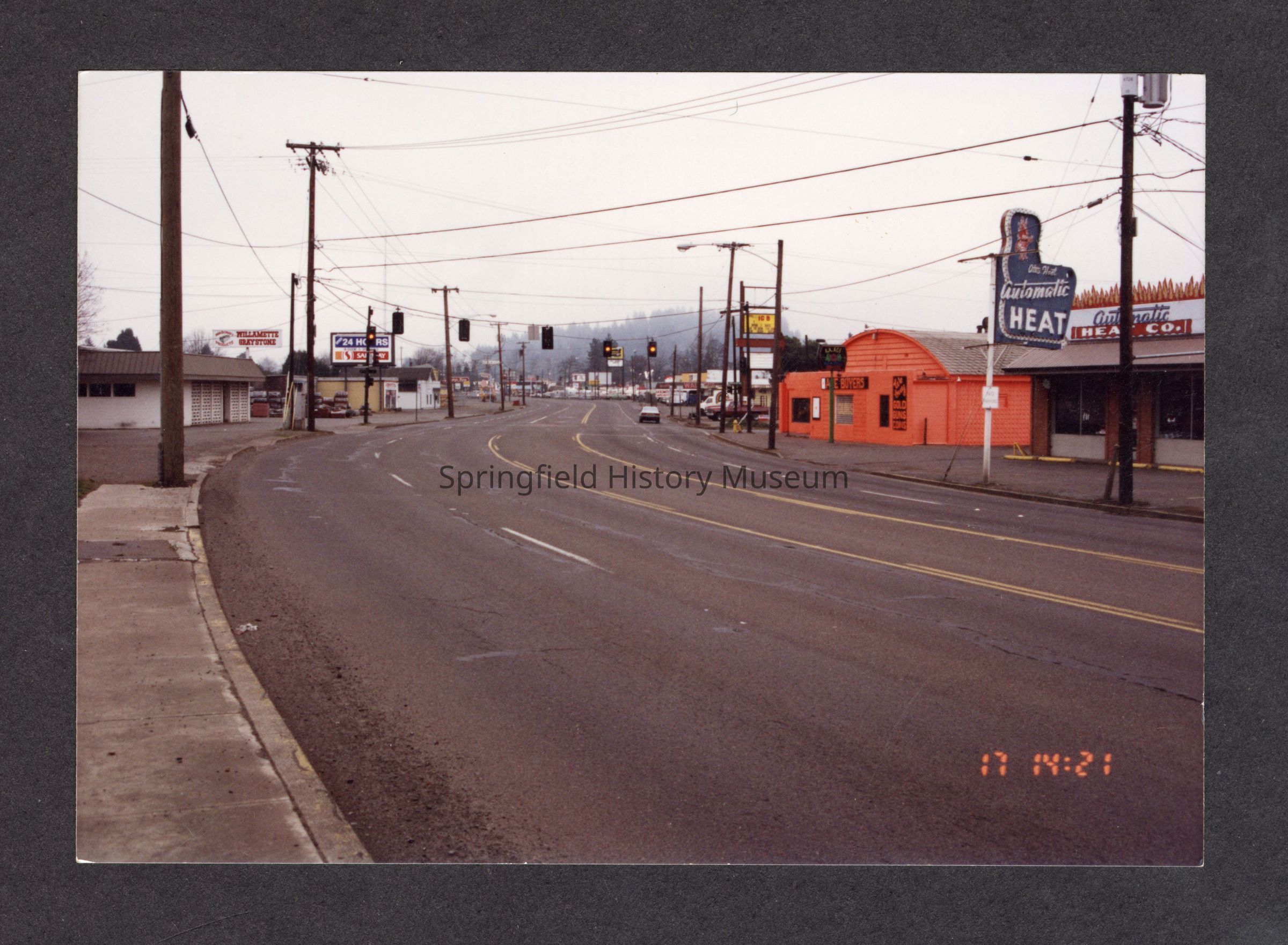 Color photograph, view of Franklin Blvd looking east, in front of Myrmo & Sons today (3600 Franklin). On left side of road, Willamette Graystone and Safeway. On right side of photo, Walker's, Ace Buyers, and Automatic Heat. Printed on bottom right, "17 14:21."Collection