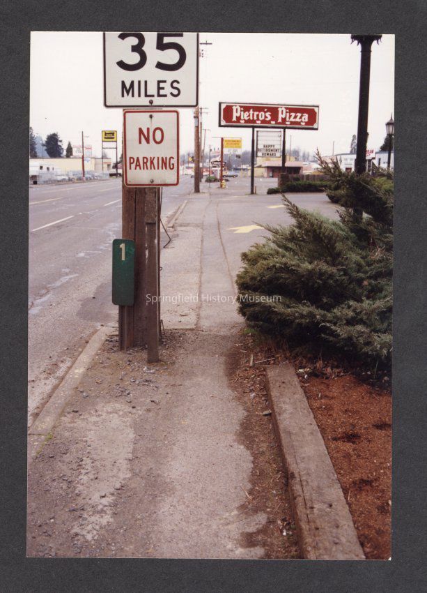 Color photograph view of Franklin Blvd looking west. Pietro's Pizza on right (now Roaring Rapids Pizza, at 4006 Franklin Blvd).Collection