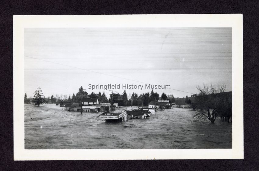 Black and white photograph of Glenwood flood from railroad trestle looking north, Kelly Butte in background. Gateway Service Station, McKenzie Gateway Aut[o C]amp, Seavers Auto Court, and Glenwood Garage.