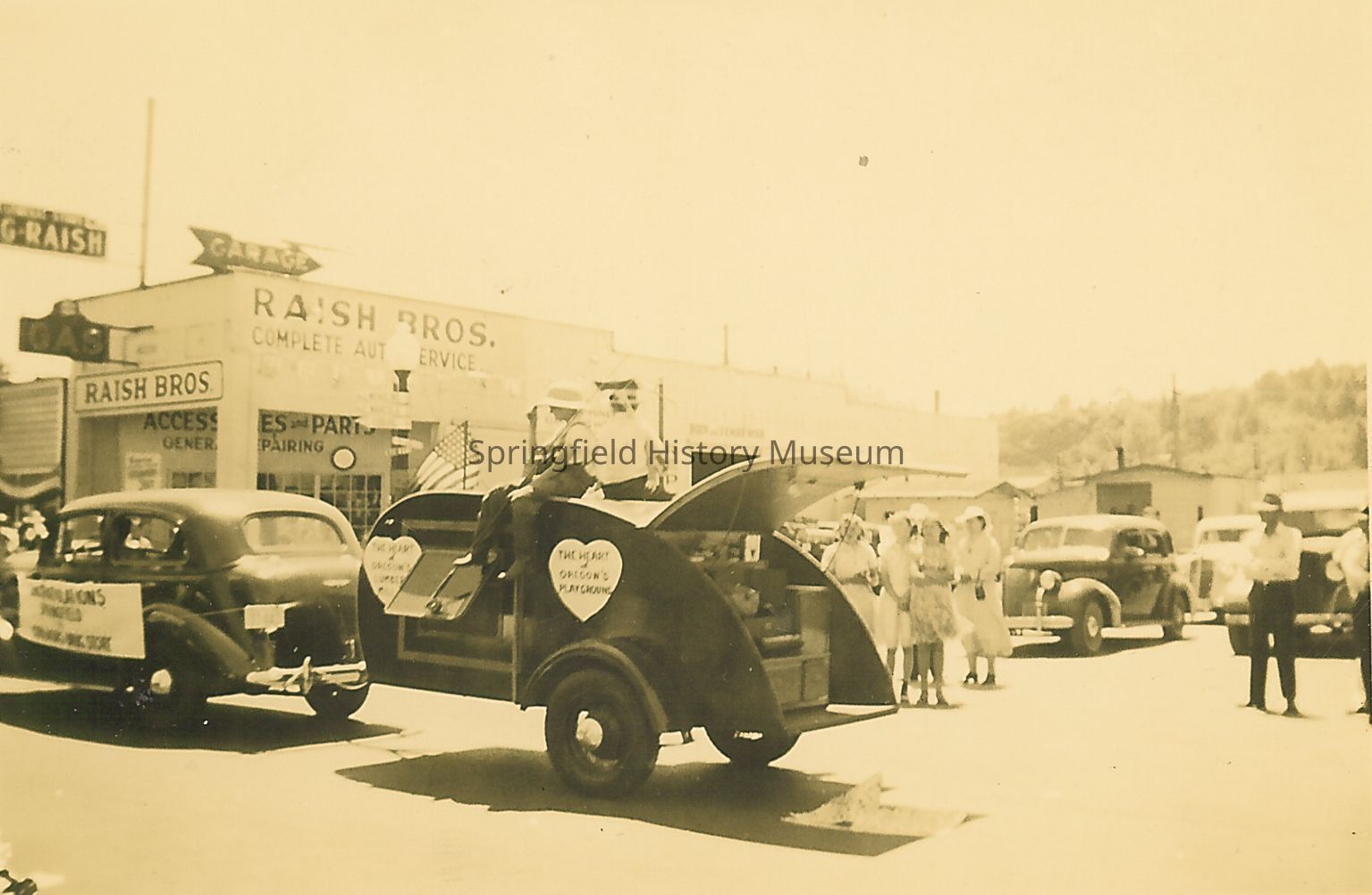 Claude Gerlach Drugstore car pulling trailer: trailer has a heart on it that says 'The Heart of Oregon's Lumber Mills" and a heart saying "The Heart of Oregon's Playgrounds." In front of Raish Bros. Complete Auto Service. 1941.