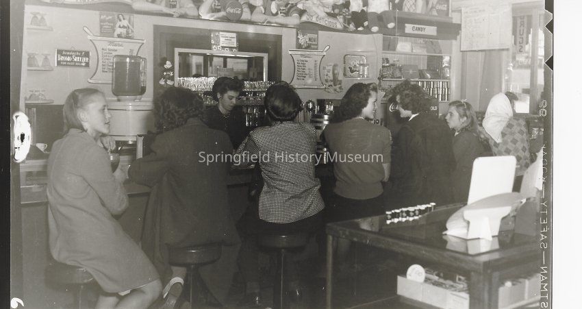 Interior of Gerlach Drug store 1940s. People sitting at soda counter with back to camera.