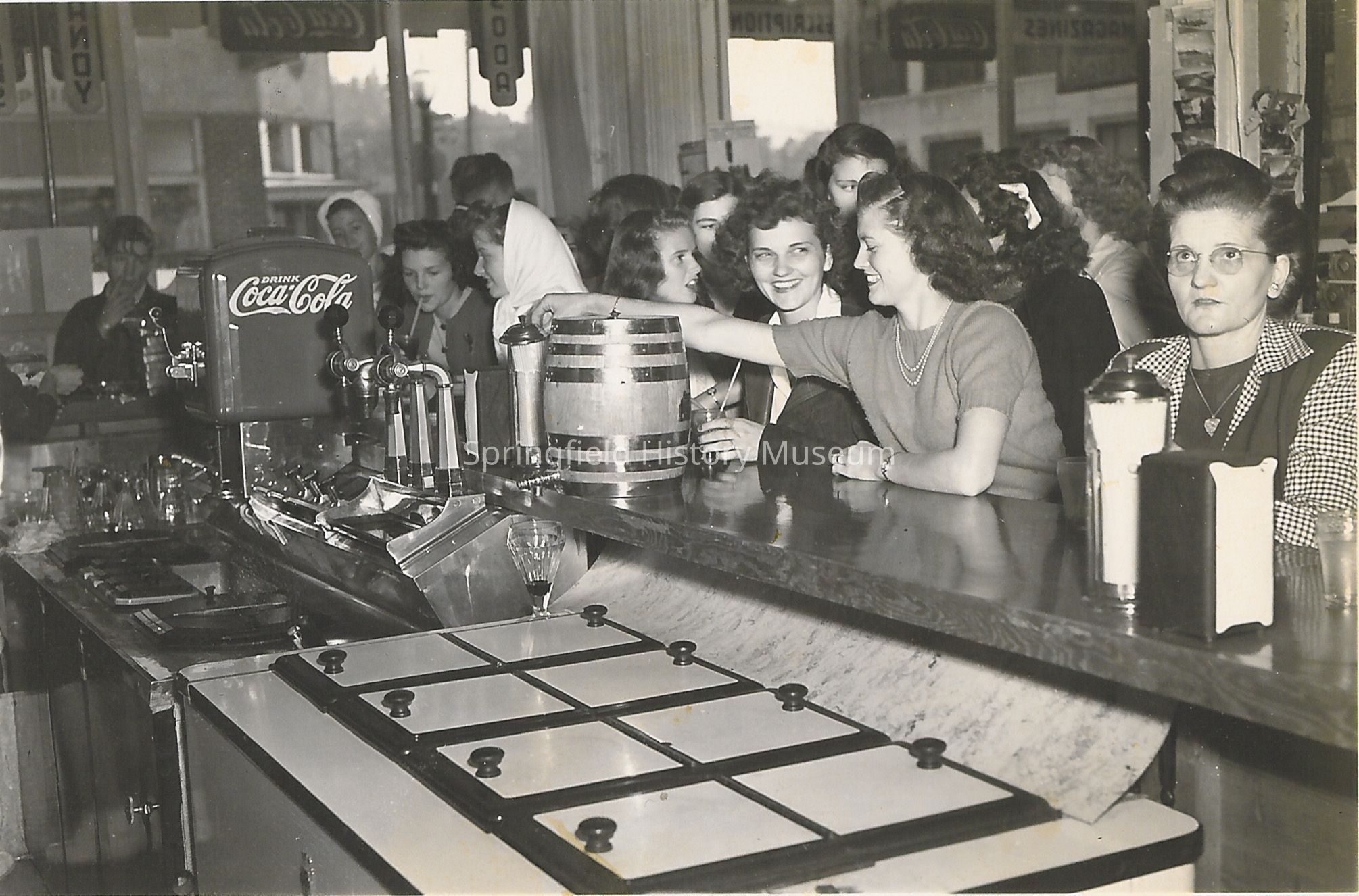 Interior of Gerlachs Drugstore. Several people sitting at counter with windows in background. Girl next to coca cola sign is Marilyn Bucklin. Drugstore is on the northeast corner of Fifth and Main Street, Springfield. Circa 1946Collection