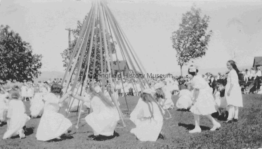 Girls around a May pole; participants in the May Day celebration at Lincoln school in 1921.