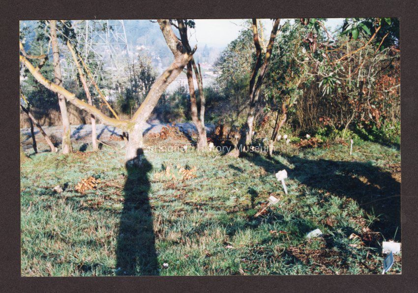 Color photograph of Glenwood cemetery. Around 20 grave markers scattered around, photographer's shadow on left, trees and transmission tower in background.Collection
