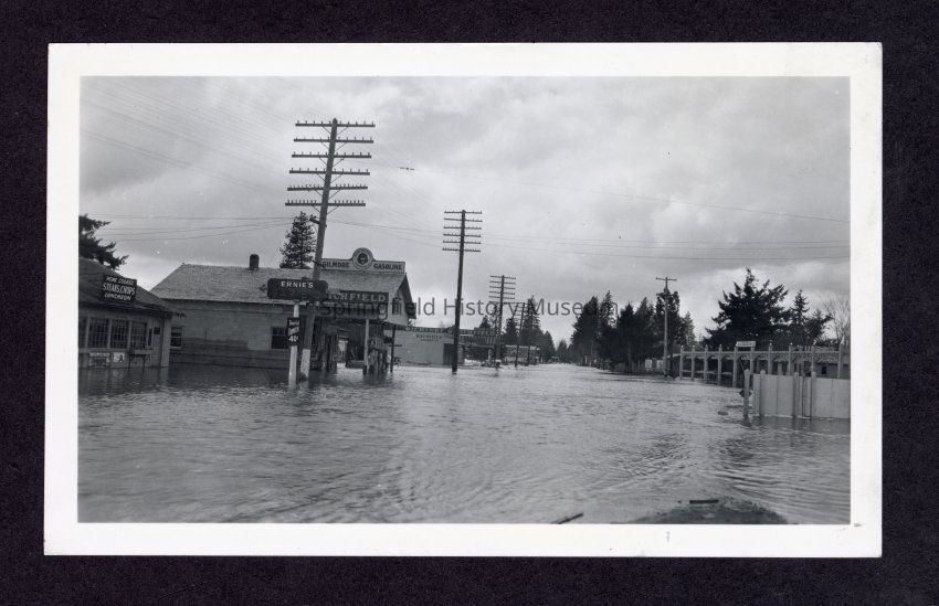 Black and white photograph of Glenwood flood, looking west on Franklin Blvd with telephone wires, taken where roundabout is today. Across the street is Gold Star Auto Court. To left, Ernie's BBQ, advertising 40 cent "tourist lunch," Gilmore Gasoline, and Richfield Products.