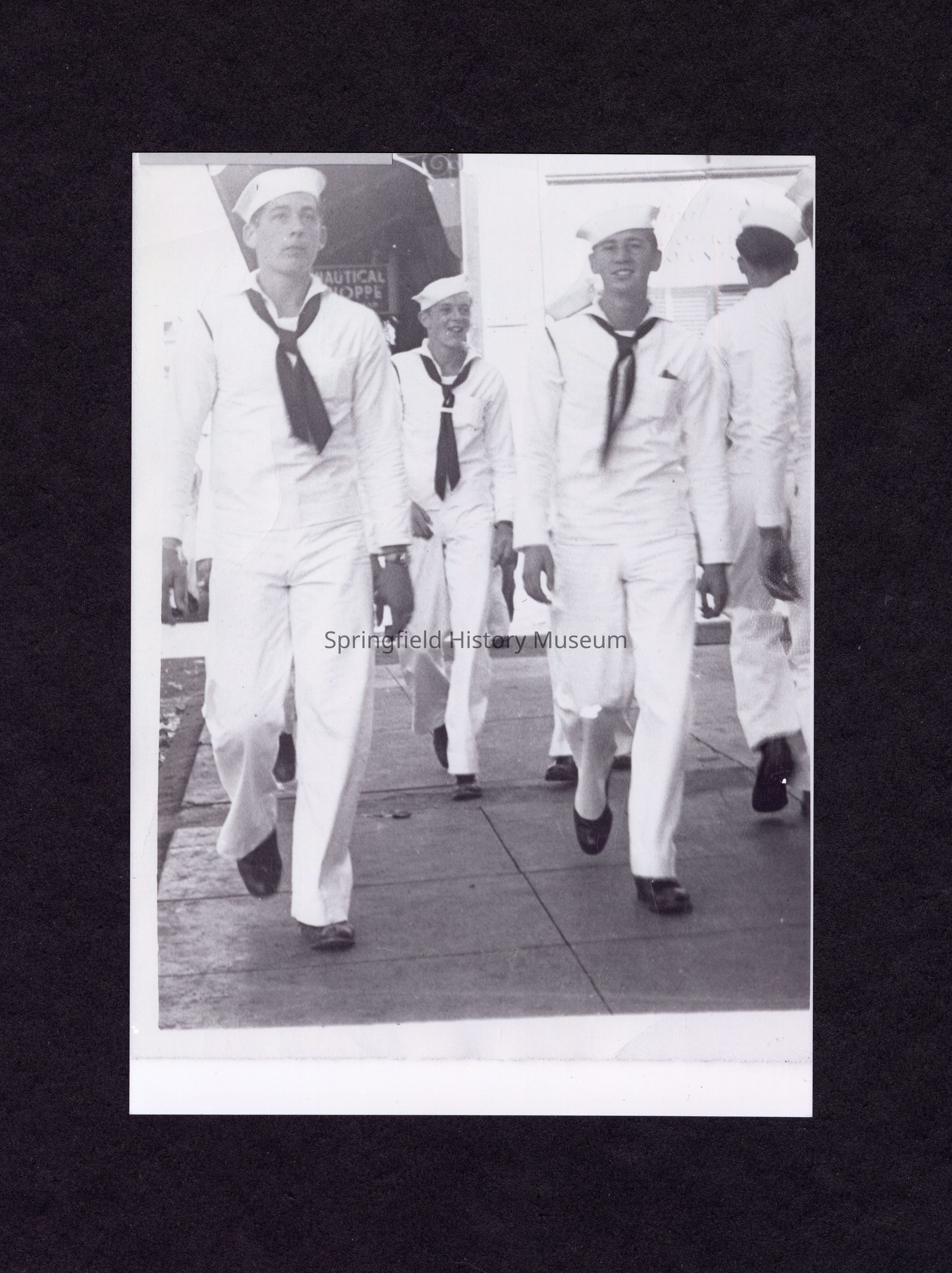 Photograph of Gordon Rennie in Navy Uniform, with two other men in uniform walking near to him undated