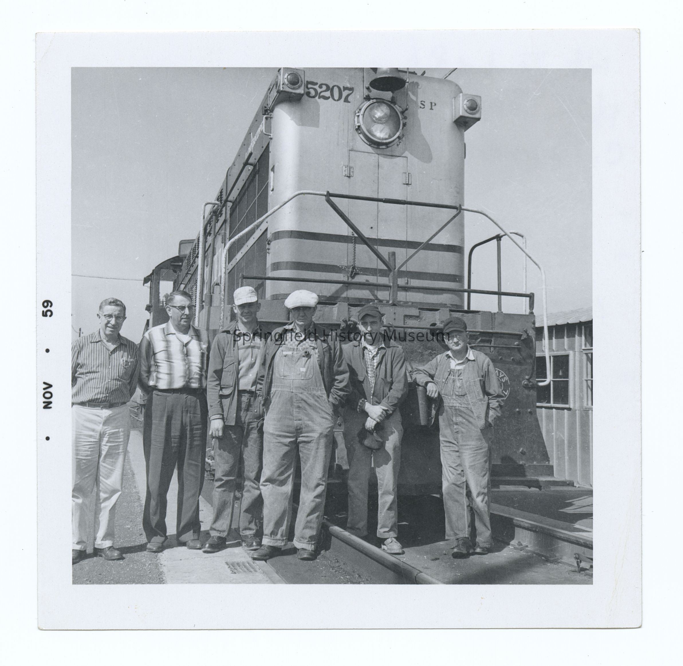 Photograph of H.R. Fox, C. Potter and others in front of '5207' South Pacific train, 1959Photograph Details