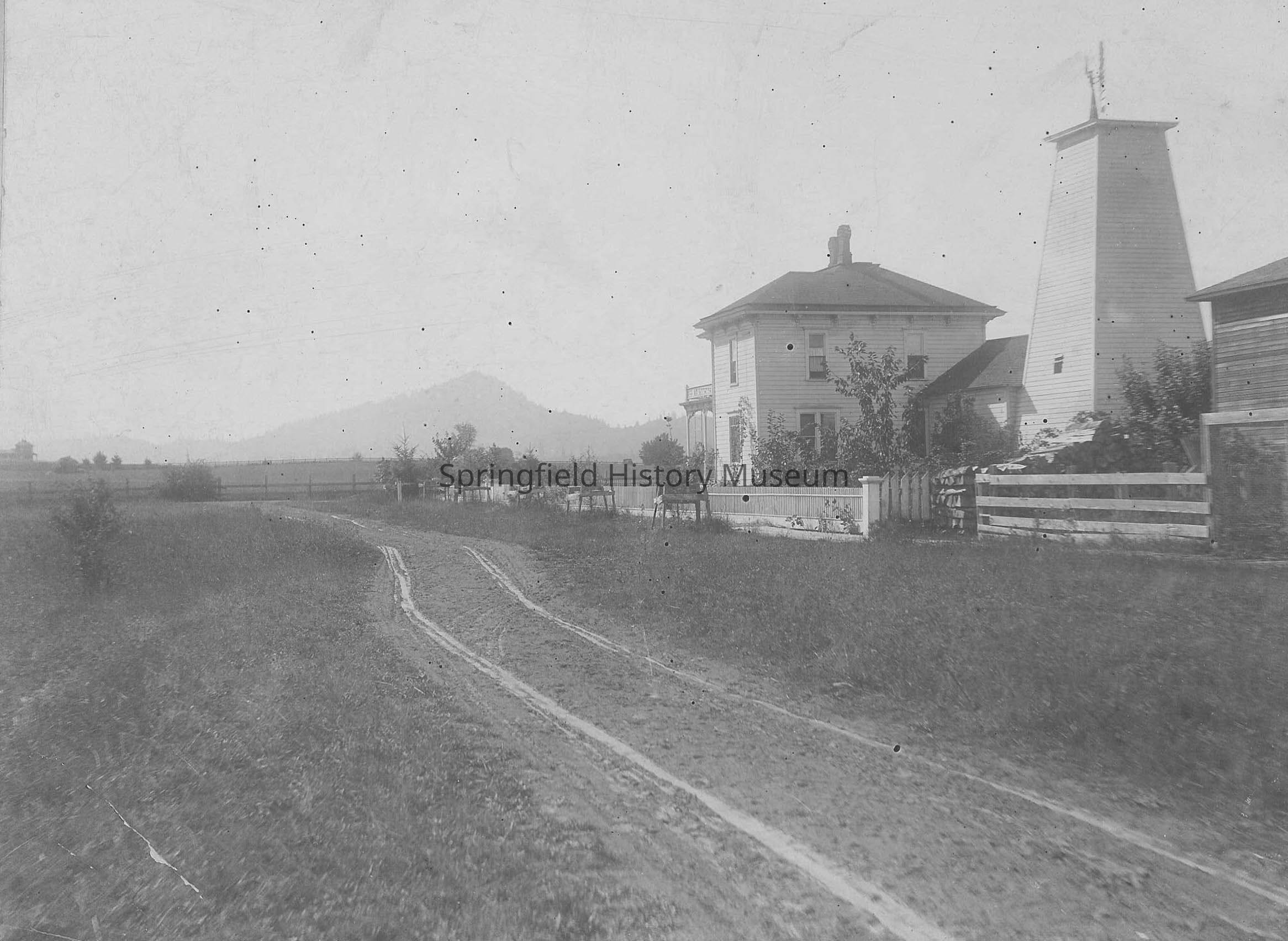 H D Wylie home on 13th and Kincaid, Eugene, mid 1890s. Probably Spencer Butte in background. House and windmill to right of muddy road.