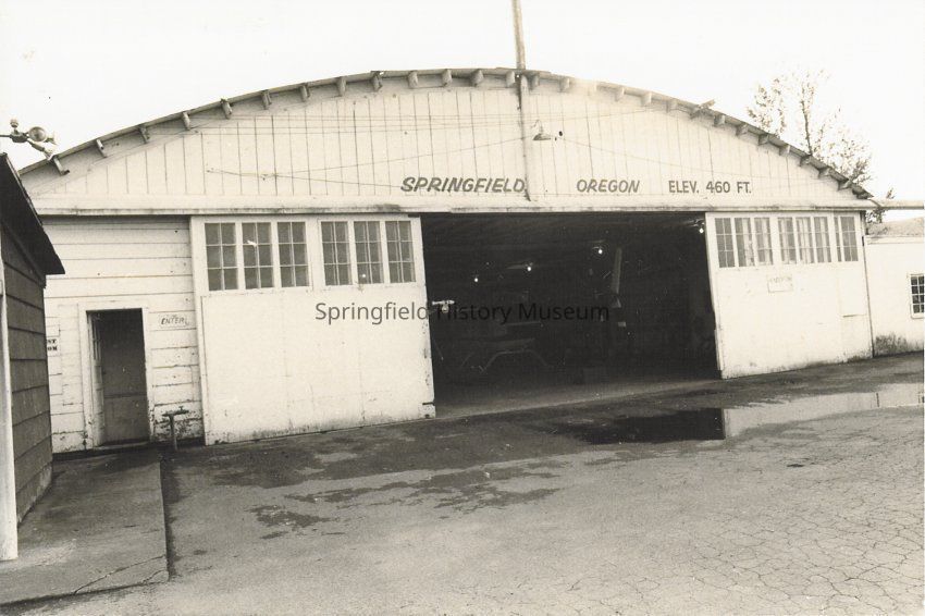Hangar with lettering reading "Springfield Oregon, Elev. 460 Ft." Undated