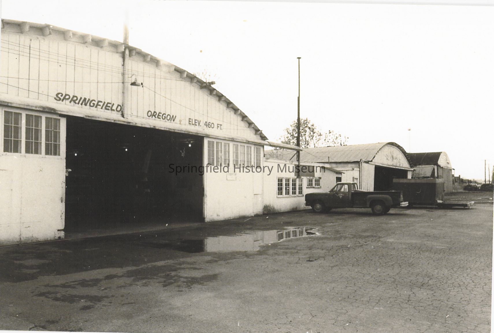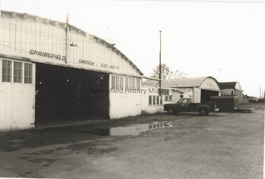 Hangars, one with lettering reading: "Springfield Oregon, Elev. 460 Ft." Undated