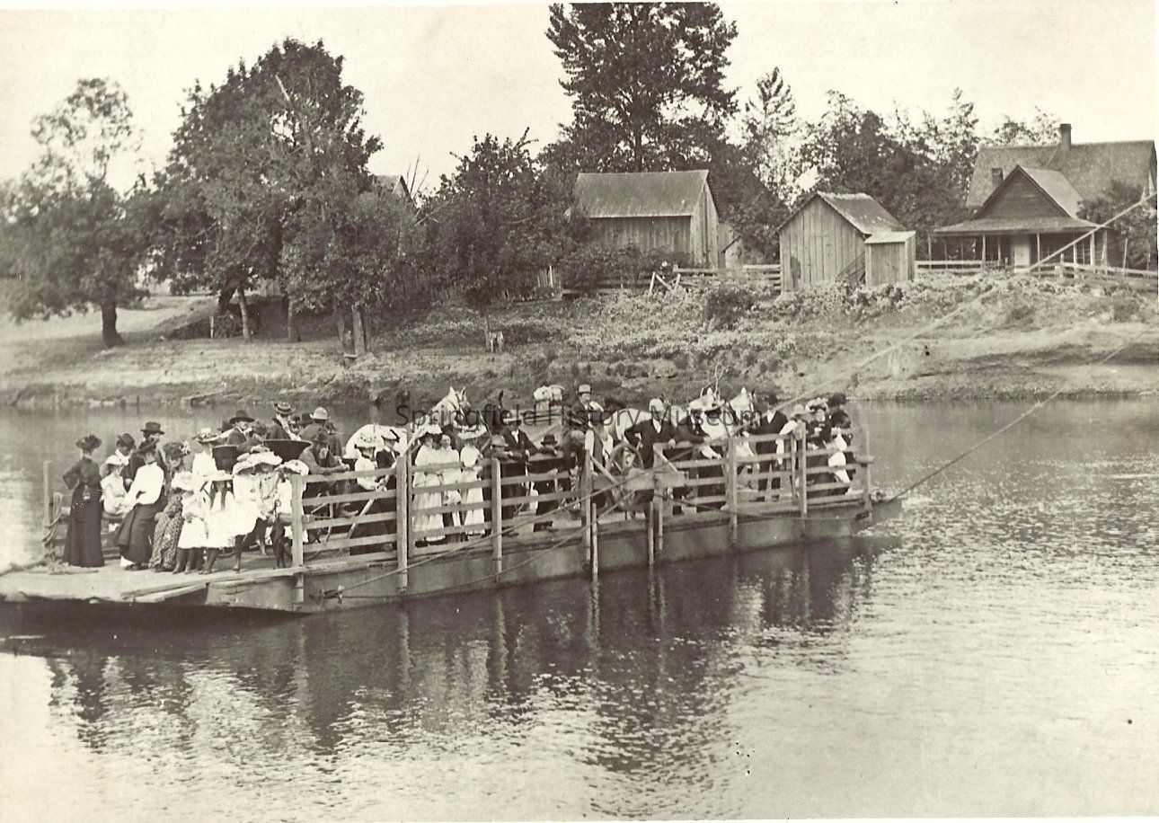 Harrisburg Ferry 1903. Several people, carrriages and a few horses riding across the river on a ferry. With trees and a house in background.
